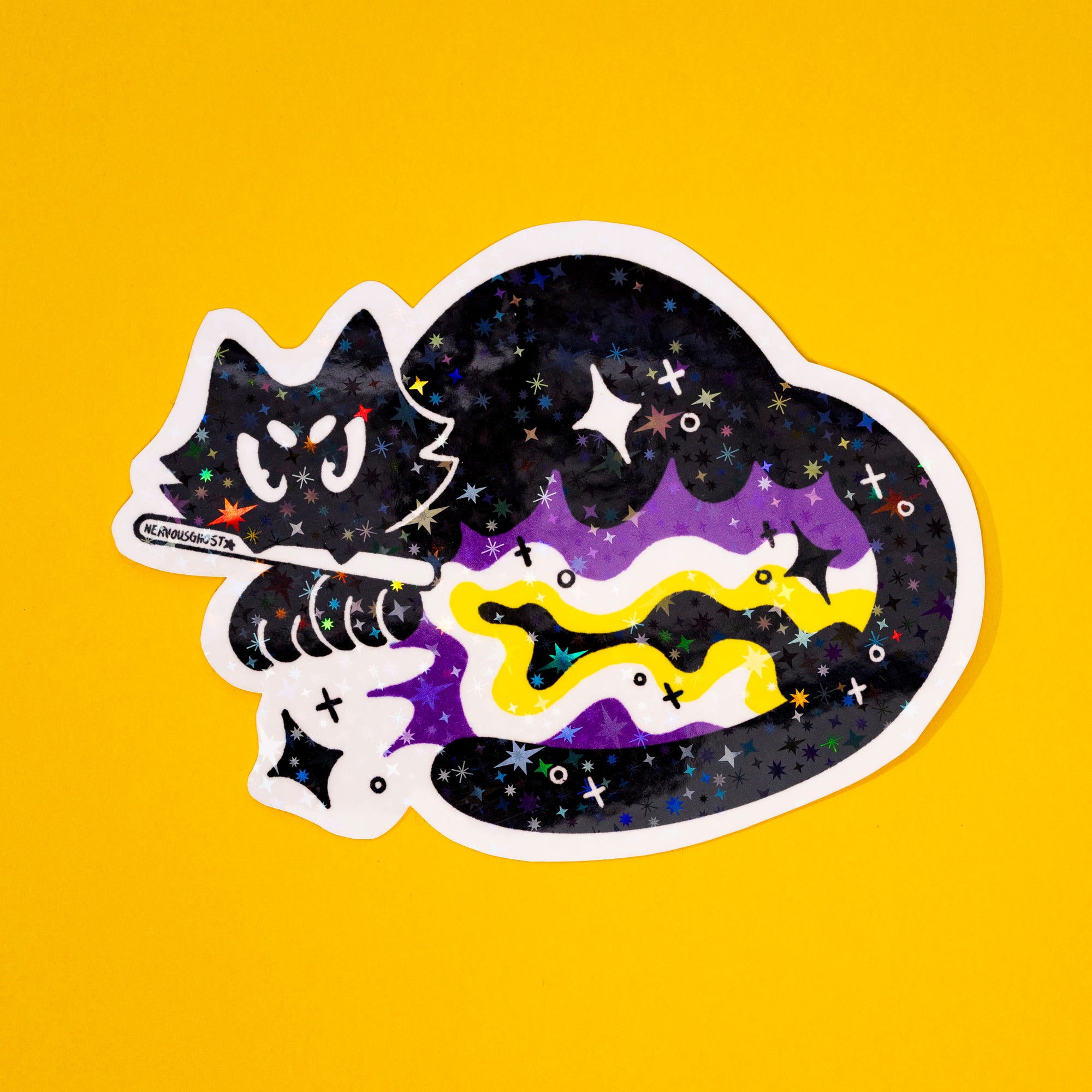 Vinyl sticker - Progress Pride cat has a holographic finish to emphasise the magic of being queer!