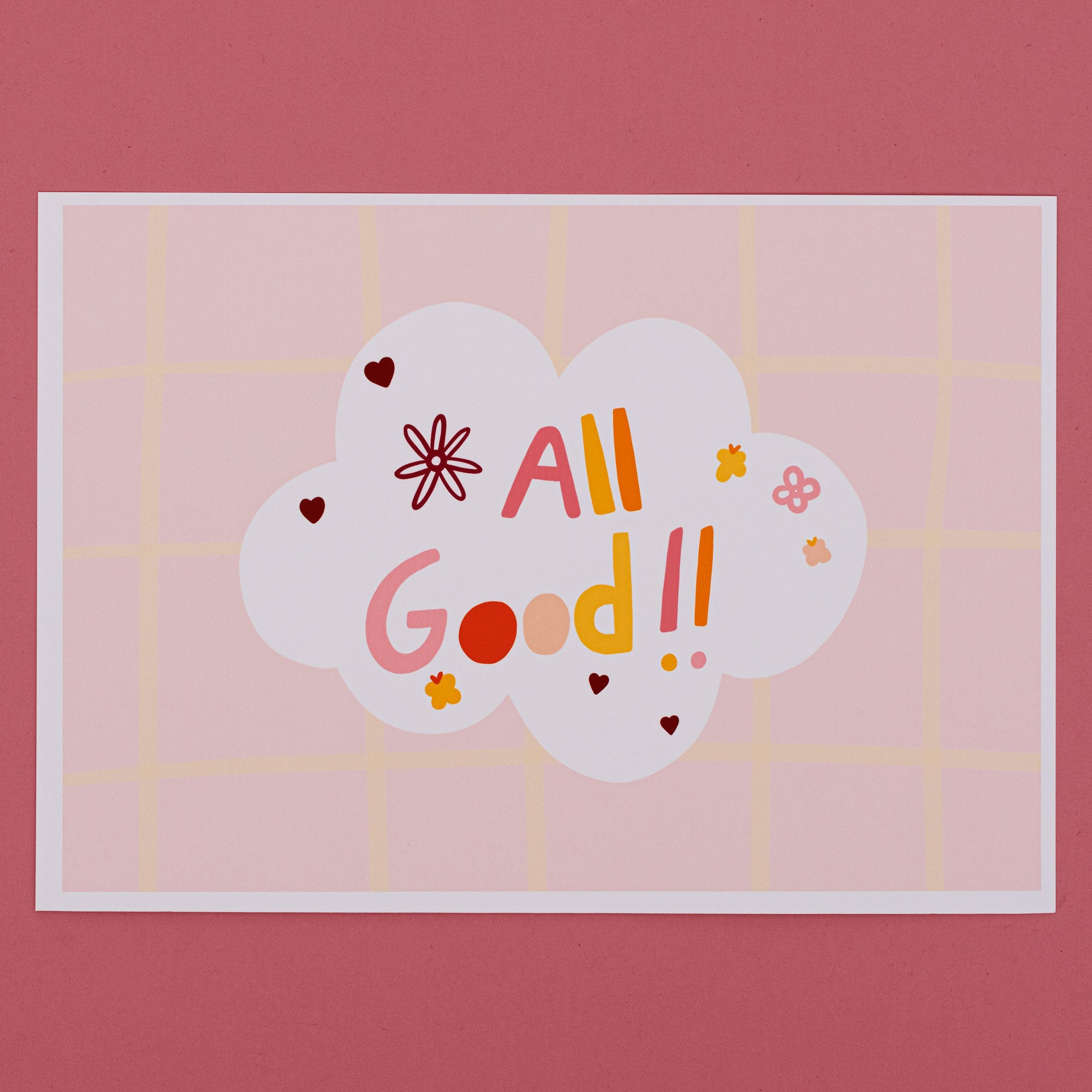 all good!!!! it’s all good!! no worries all good!! // Unframed a5 fine art print - printed in Melbourne using a Canon Pixma iP8760 on Epson Matte Archival Paper 189gsm. Please note colours on screen may vary slightly from the final printed artwork.