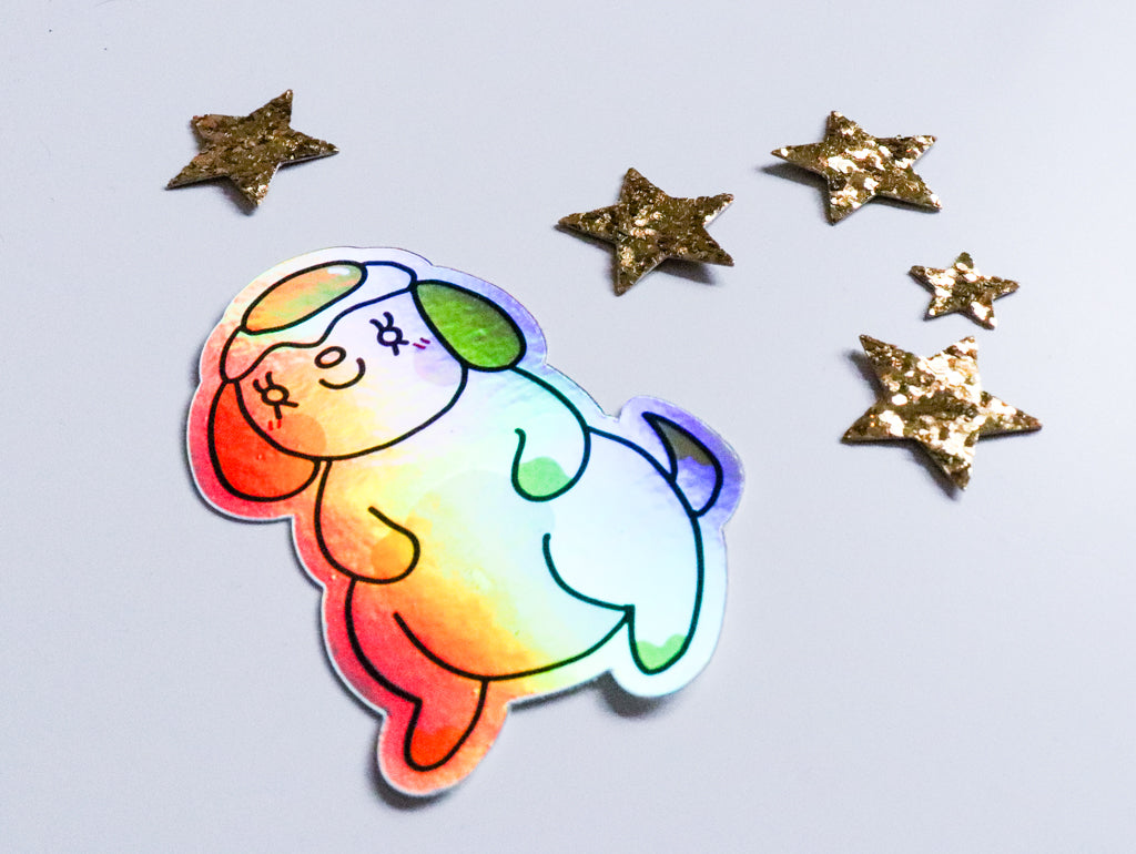 Little holo eggdog, served sunny side up. Printed on holographic vinyl by Stickermule.
