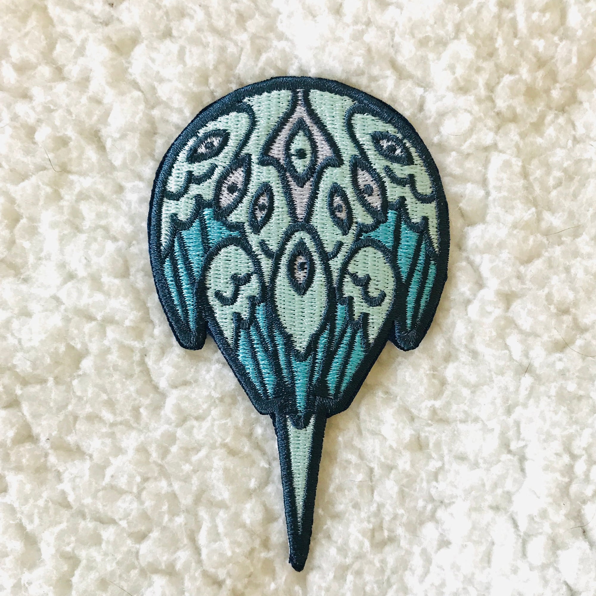 Behold the horseshoe crab, healer and provider of the holy blood! Horseshoe crabs are important to the medical industry due to their unique, copper-based blue blood. The patch is 4.5 inches (11.4 cm) long, embroidered, with an iron-on backing.