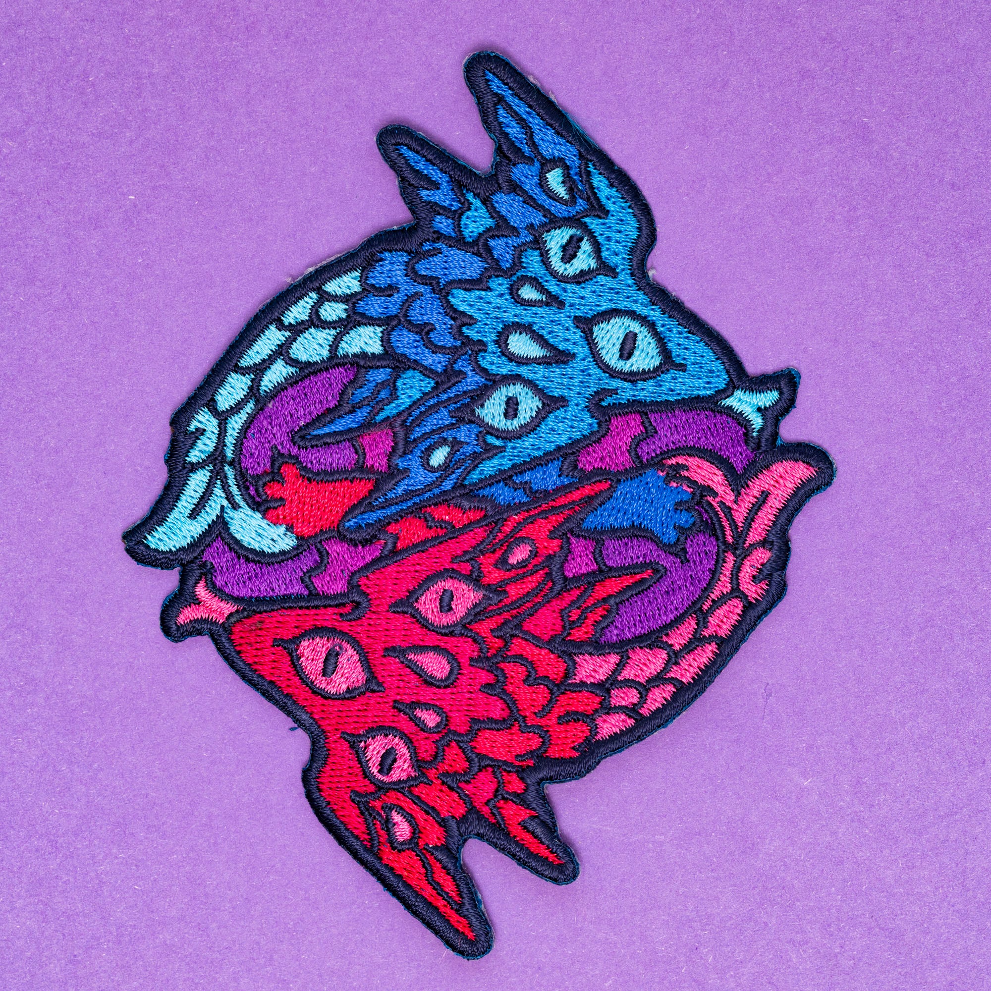 A pair of fish-tailed angels, for Bisexual pride.The patch is 4 inches (10 cm) on the longest side, embroidered with an iron-on backing. The backing should last for 25 washes. I recommend putting a few stitches in so you don’t lose the patch.