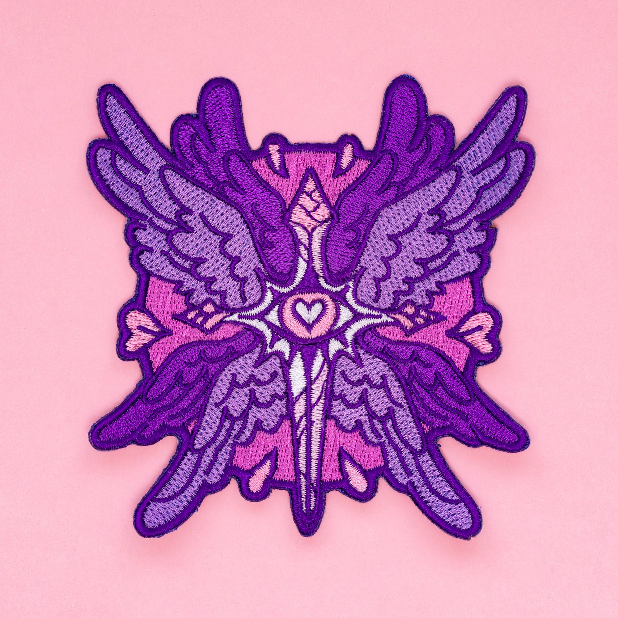 A pink and purple angelic sword, for Sapphic pride.The patch is 4 inches (10 cm) on the longest side, embroidered with an iron-on backing. The backing should last for 25 washes. I recommend putting a few stitches in so you don’t lose the patch.