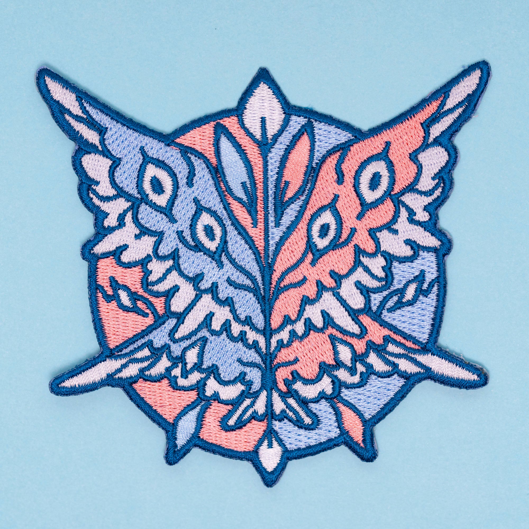 A moth-like seraph with pink and blue wings, for Transgender pride.The patch is 4 inches (10 cm) on the longest side, embroidered with an iron-on backing. The backing should last for 25 washes. I recommend putting a few stitches in so you don’t lose the patch.