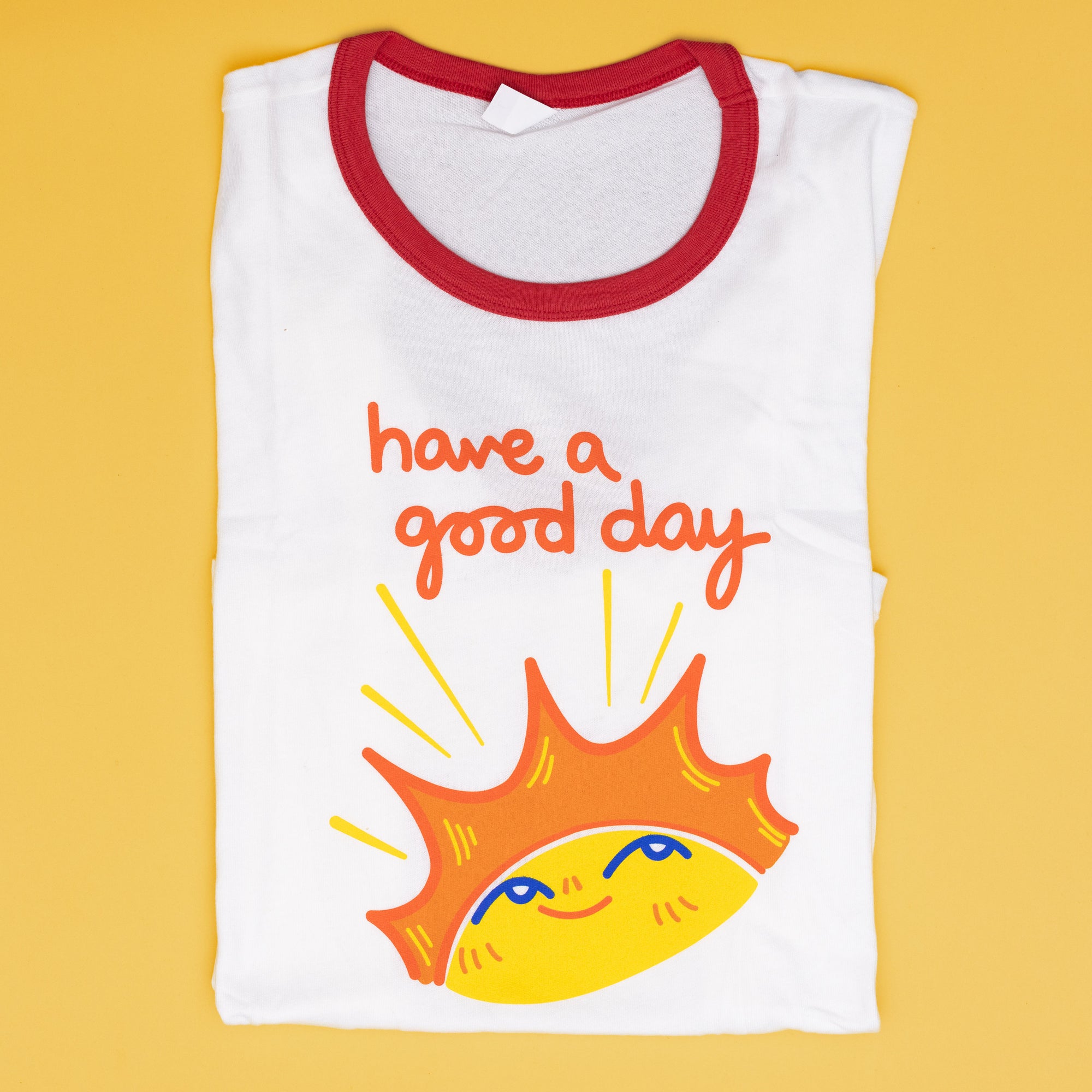 Have a good day - or at least, try to, while sporting this unisex screen printed ringer tee! Notes about the fit: these shirts run large, with room to spare - these are best suited to be styled cropped or tucked in for short folks!