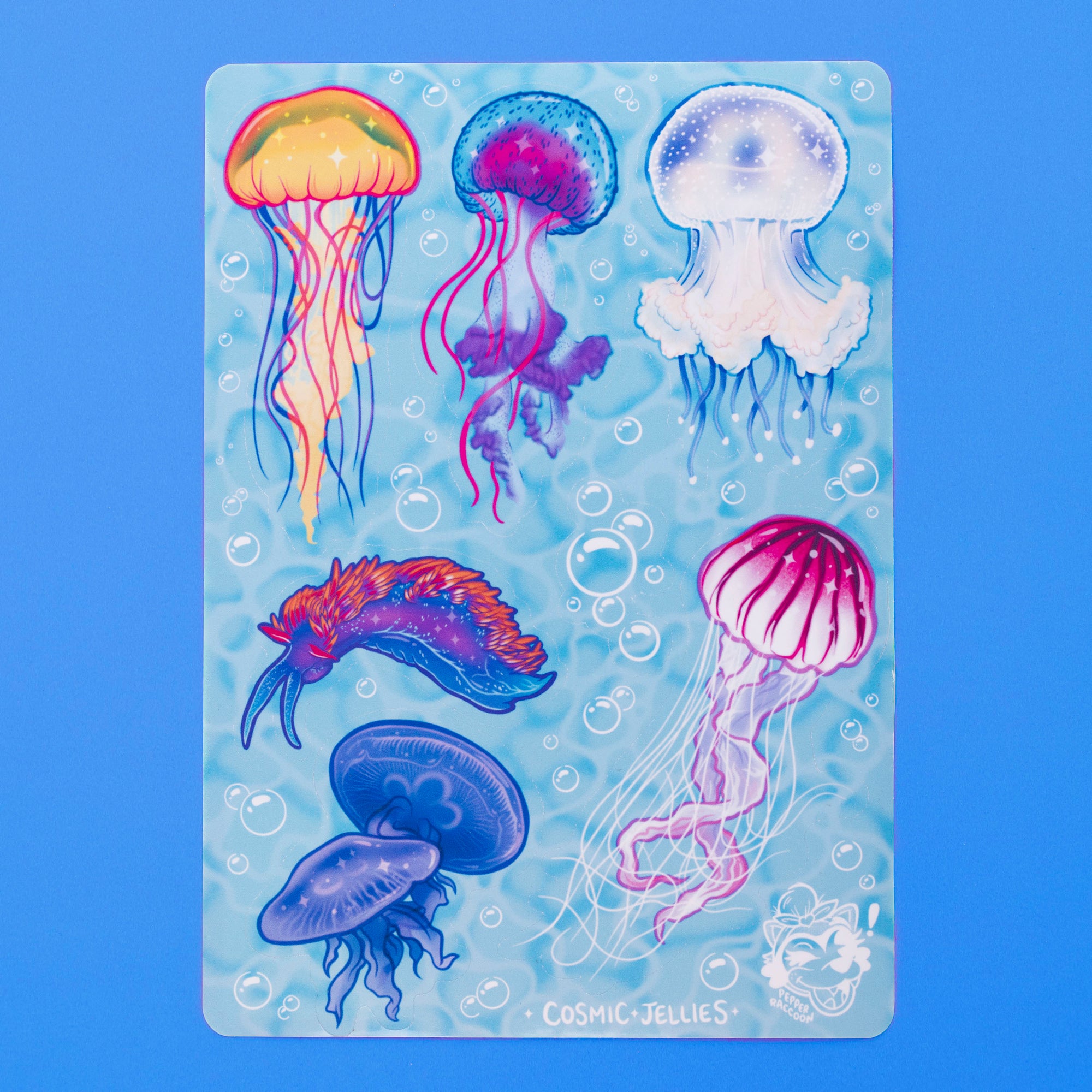 This Cosmic Jellyfish sticker set practically glows, with vibrant colours and rainbow sparkles. All of the jellyfish are real sea creatures, including Moon Jellies, Pacific Sea Nettle, a nudibranch, and more!