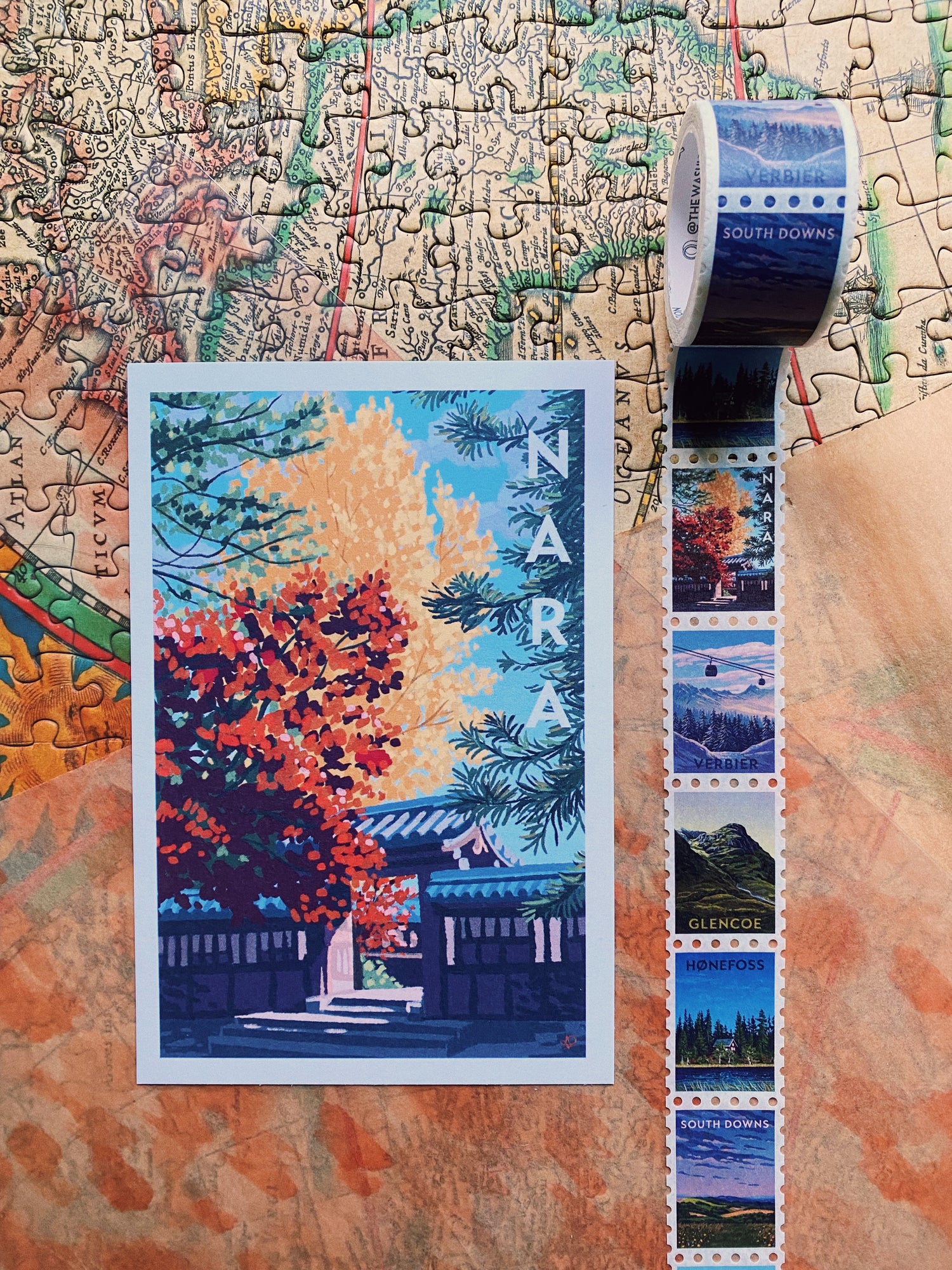 Beautifully detailed and textured postcard features Allie’s Nara travel poster image.
