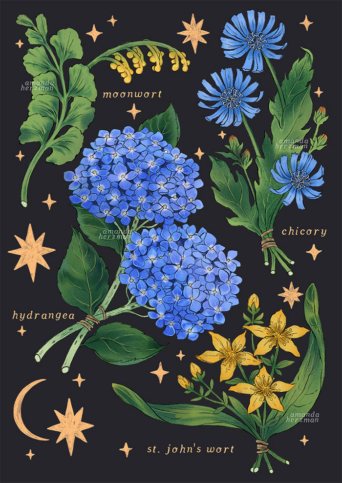 Take this before you go - plants for undertaking a journey. Moonwort for breaking locks & revealing hidden paths, chicory for invisibility, hydrangea for breaking hexes. And st john's wort for protection against evil spirits.