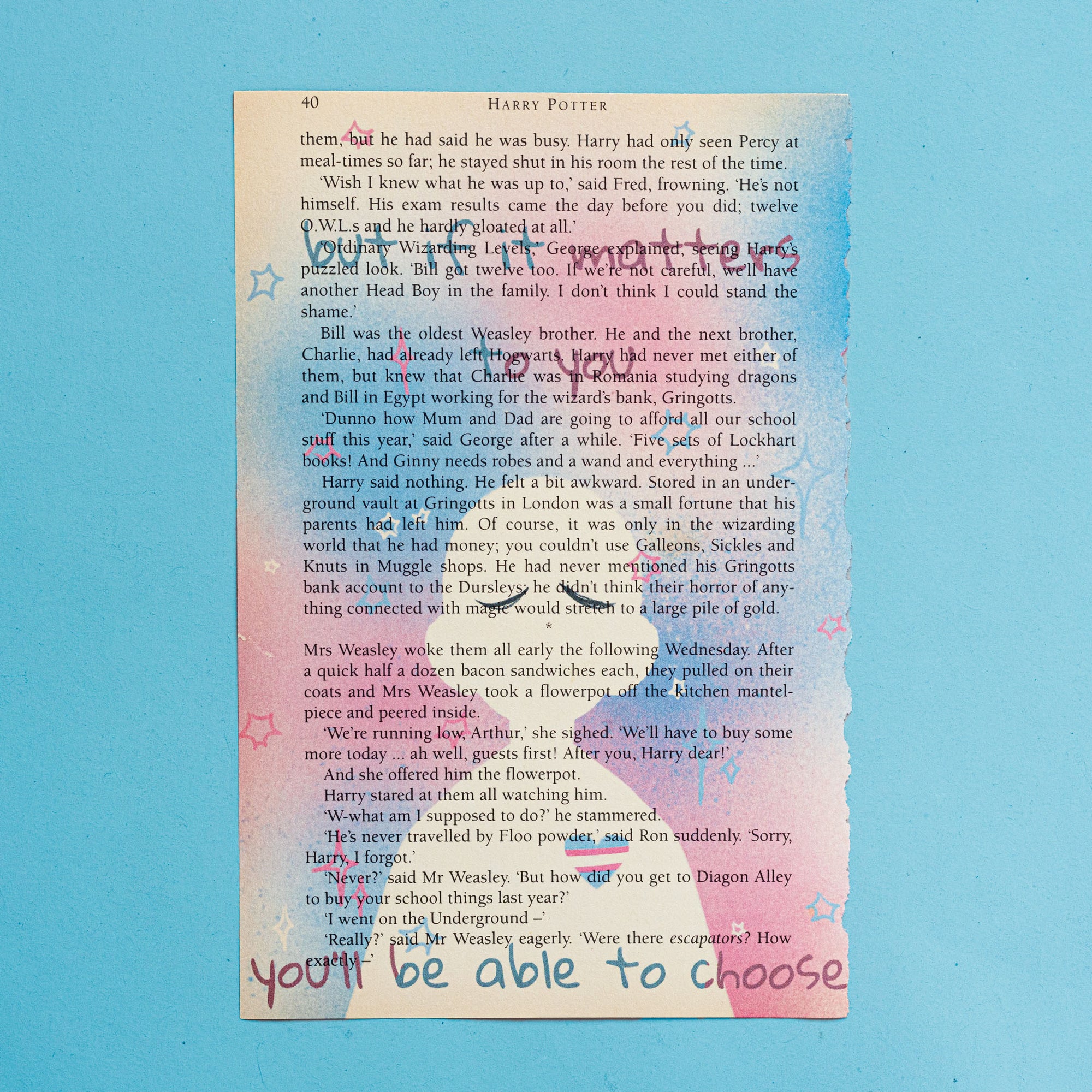 Printed on reclaimed pages of magical wizard parchment, this artwork transforms these pages into a celebration of the strength and story of trans people and communities on Trans Day of Visibility.