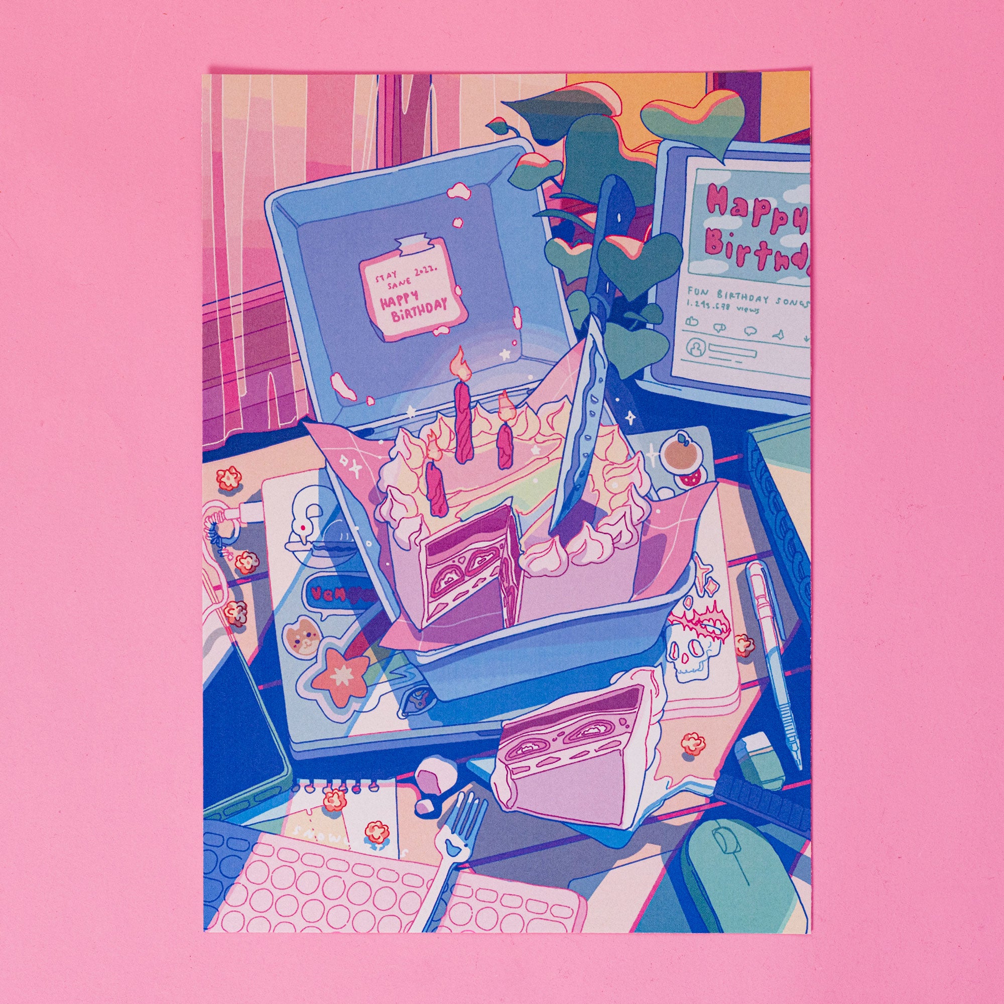 A Birthday cake for one.This is the Snowlattes way of cutting the cake, the way it is and how it should always be! A special Snowlattes illustration for their birthday, and it of course, never ends well.Printed onA5 Fancy Textured Paper 270-300gsm.