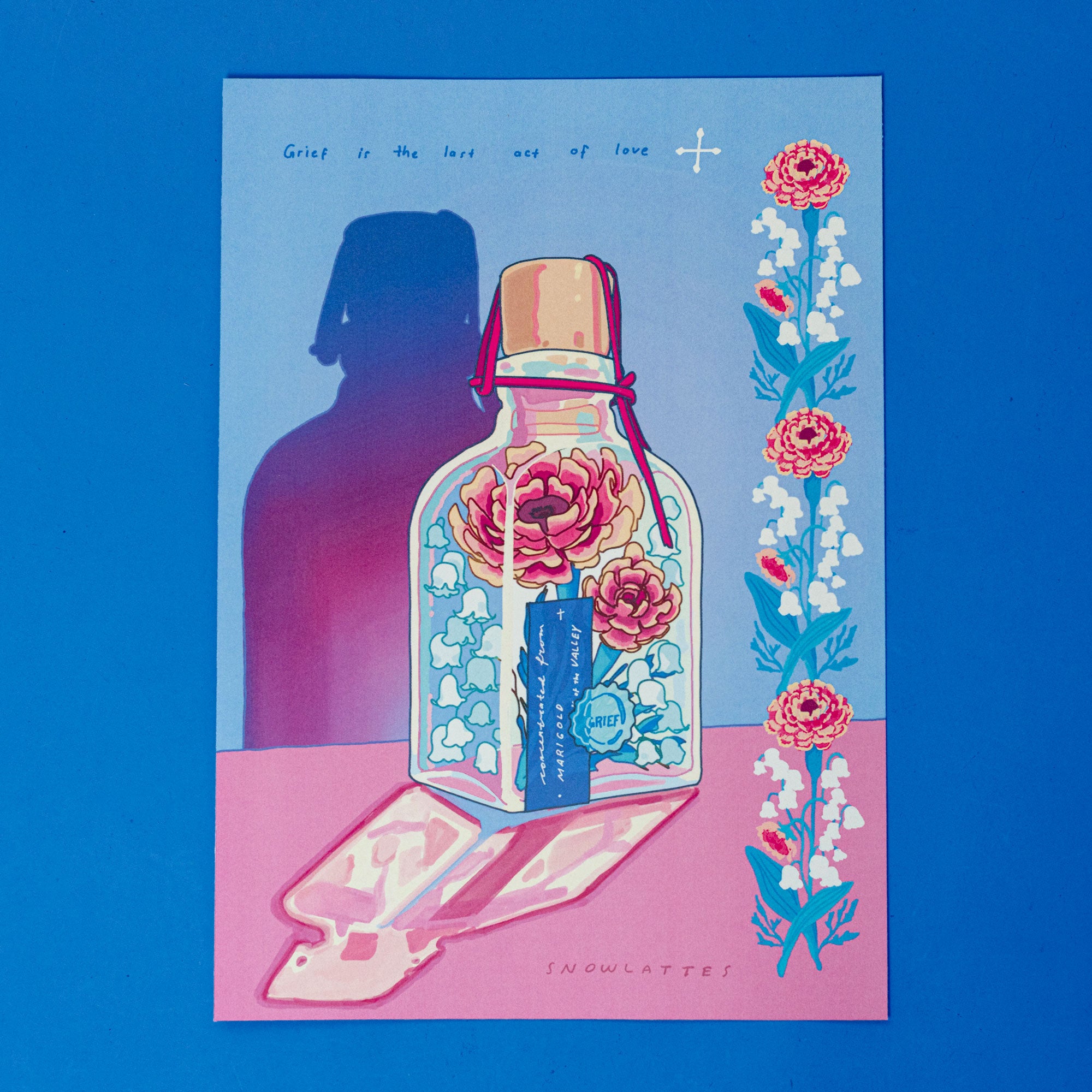Bottling up feelings of anger, grief and resentment. Are you feeling it too?Featuring the Bottled Emotions Print series, illustrated by Snowlattes. 3 Illustrations depicting negative emotions through a variety of flowers for the composition of each Bottled Emotion. Bottled Anger consisting of Petunia and Red Tulip, Bottled Resentment consisting of Tansy, Lavender and Basil, and last of all, the Bottled Grief consisting of Marigold and Lily of the Valley.