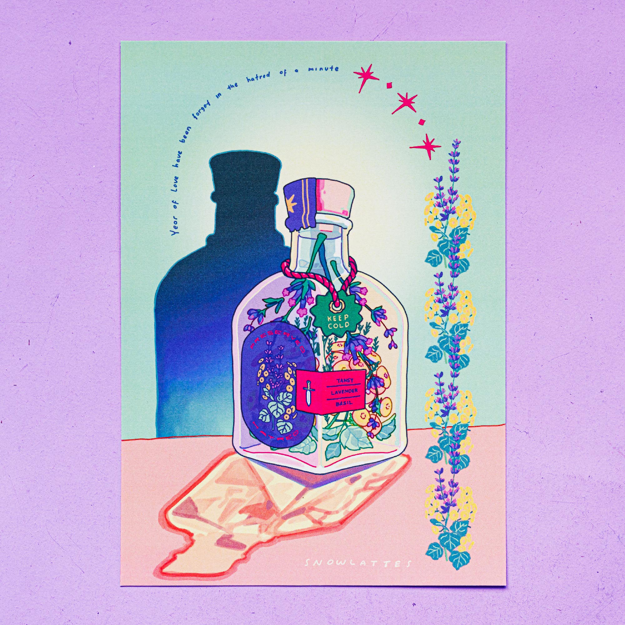 Bottling up feelings of anger, grief and resentment. Are you feeling it too?Featuring the Bottled Emotions Print series, illustrated by Snowlattes. 3 Illustrations depicting negative emotions through a variety of flowers for the composition of each Bottled Emotion. Bottled Anger consisting of Petunia and Red Tulip, Bottled Resentment consisting of Tansy, Lavender and Basil, and last of all, the Bottled Grief consisting of Marigold and Lily of the Valley.