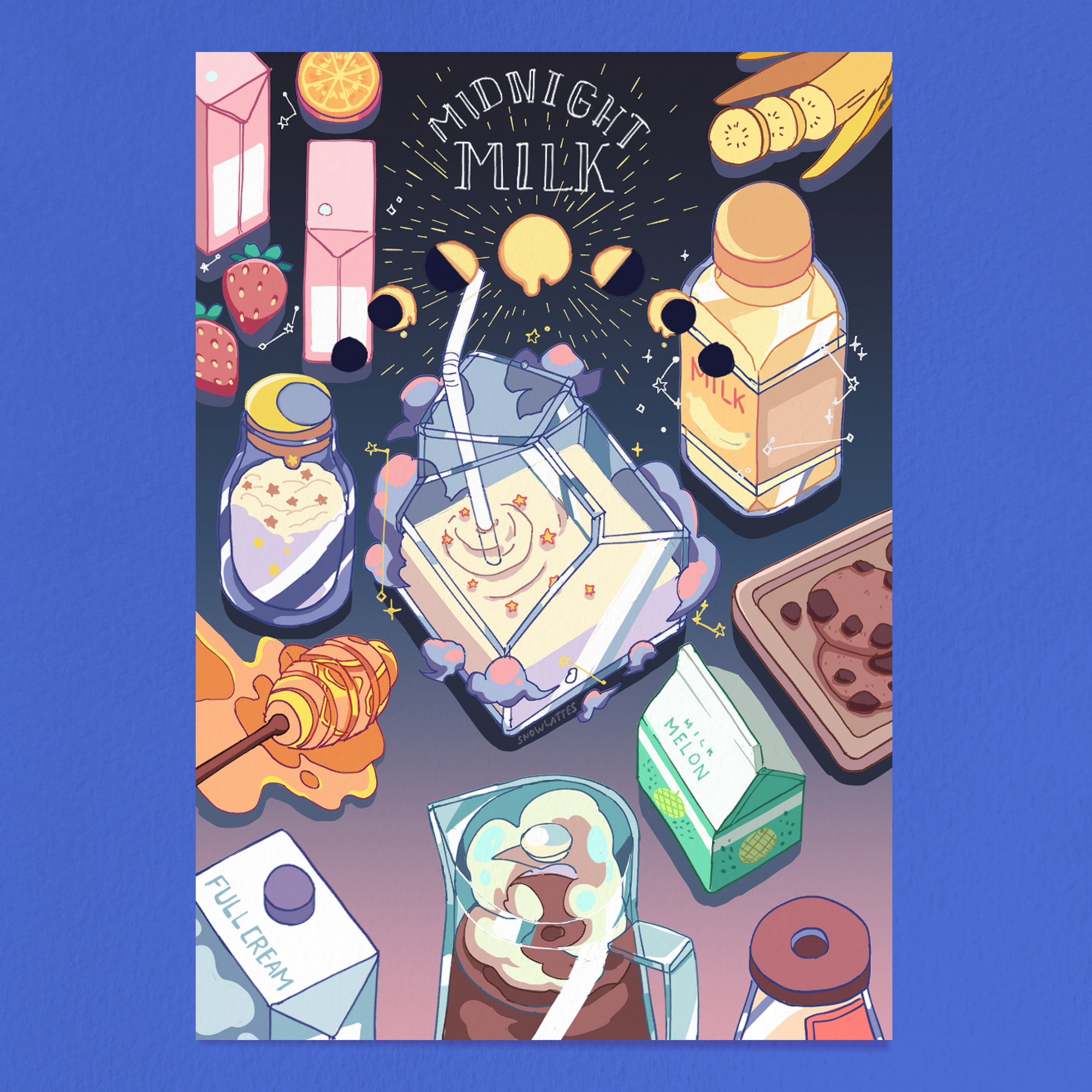 The trick to a good night's sleep sometimes is warm milk before you head to bed. Perhaps with a dash of honey or cookies to dip in if you feel like a midnight snack?This Midnight Milk illustration by Snowlattes shows the different kinds of ways to prepare your milk for a midnight snack for those who are well a bit of a sweet tooth~