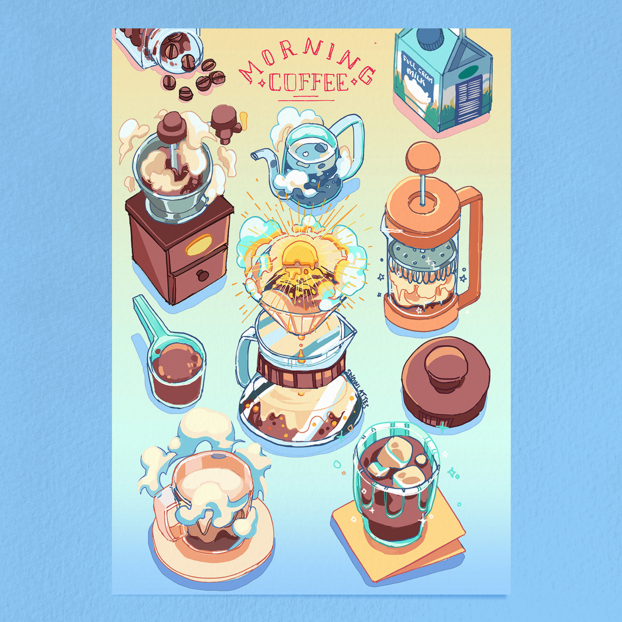 The relaxing sounds of fresh coffee beans grinding in the machine. The strong and fragrant aroma or burnt coffee seeping from the warm cup. The slow and steady swirls of warm milk and cream on top. Always start your day right with a nice cup of coffee! A beautiful illustration of Morning Coffee by Snowlattes showing the different ways to make your coffee.