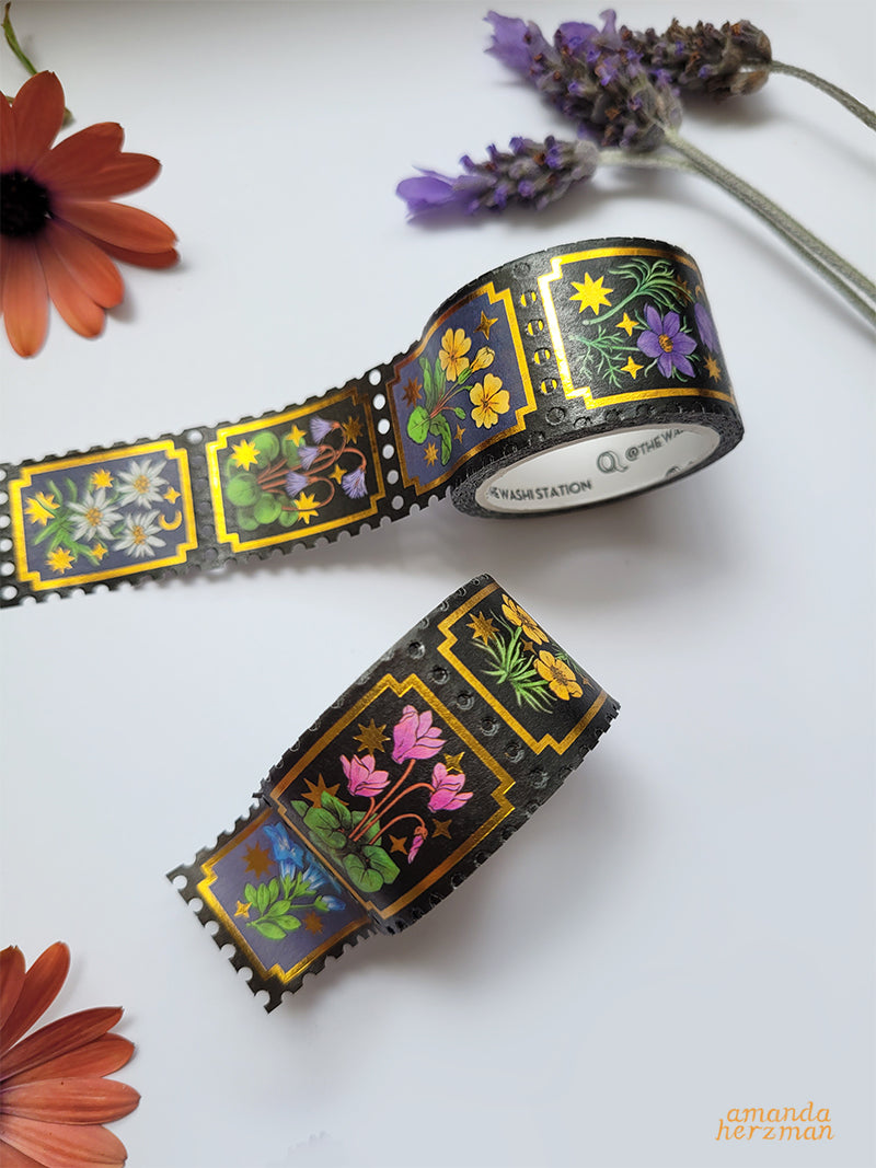 Featuring plants that are happy in high, alpine meadows and craggy mountain sides, alpine plants are small, surprising treasures for the adventurous mountaineer. This gold foil stamp tape features cyclamen, edelweiss, pasque flower, alpine buttercup, moonwort, gentian and primrose. The washi is 2.5cm, on a 5 metre roll.