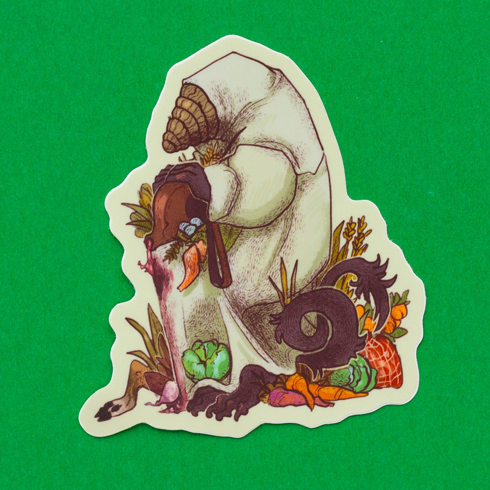 Celebrating the harvest moon with a creature-inspired medieval beekeeper and a wealth of harvest!This durable vinyl sticker is great for cars, water bottles, laptops, your fridge if you're feeling it, or maybe a spare jar of honey?
