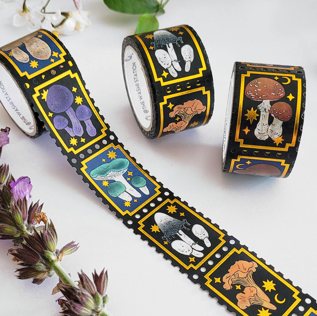 Mushrooms of the fields and forests. This gold foiled, glittery washi tape features seven different mushrooms.