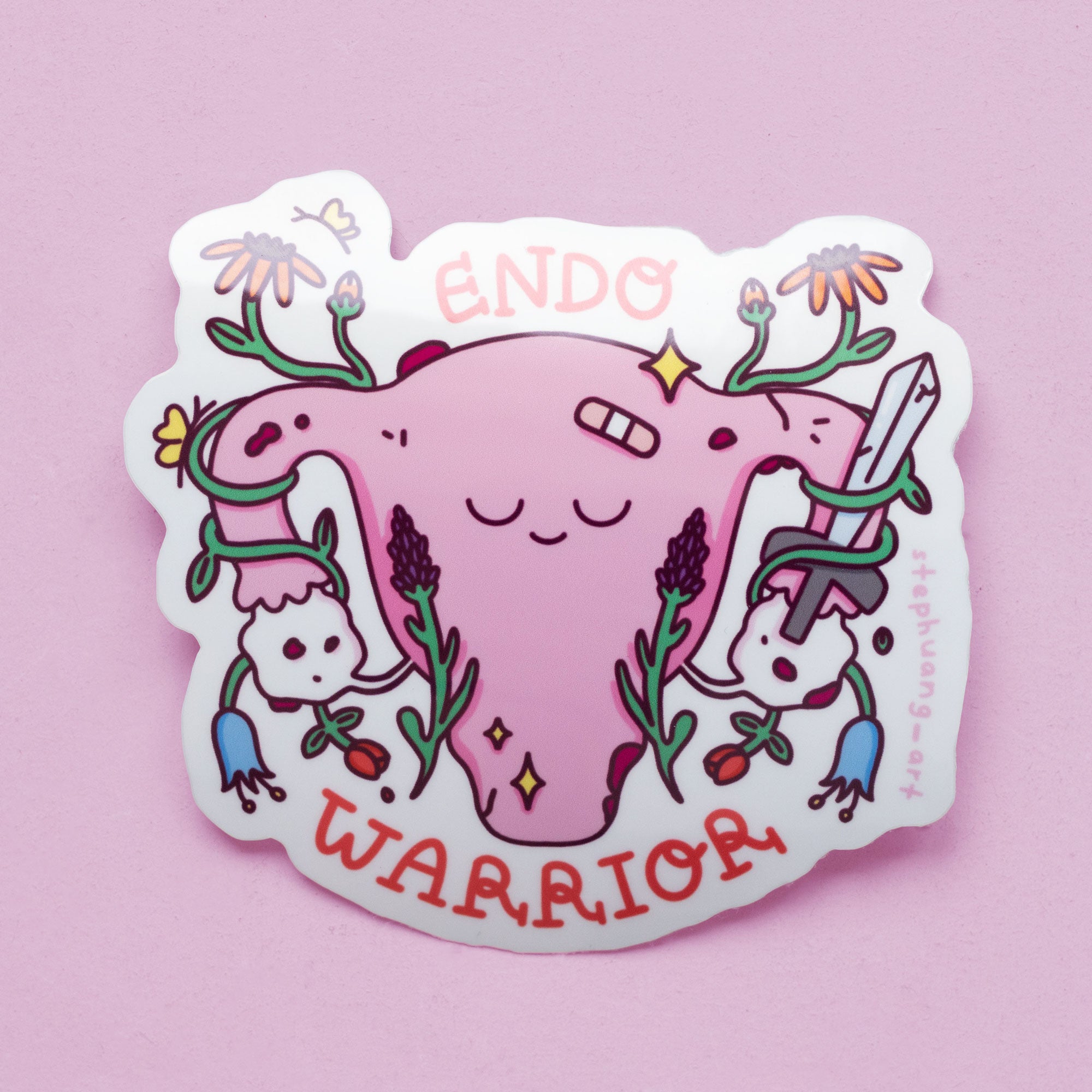 In 2021, I was diagnosed with stage 4 endometriosis after a cyst rupture and I had to get emergency surgery. I was feeling hopeless for many months afterward, but I decided to channel my feelings into my art and create this sticker to help other endo patients struggling with the disease. Depicted here is a uterus covered with adhesions and wielding a sword to show that us endo warriors are strong! Stick this somewhere to empower yourself, to help you get through the day, and to spread awareness of this disease.