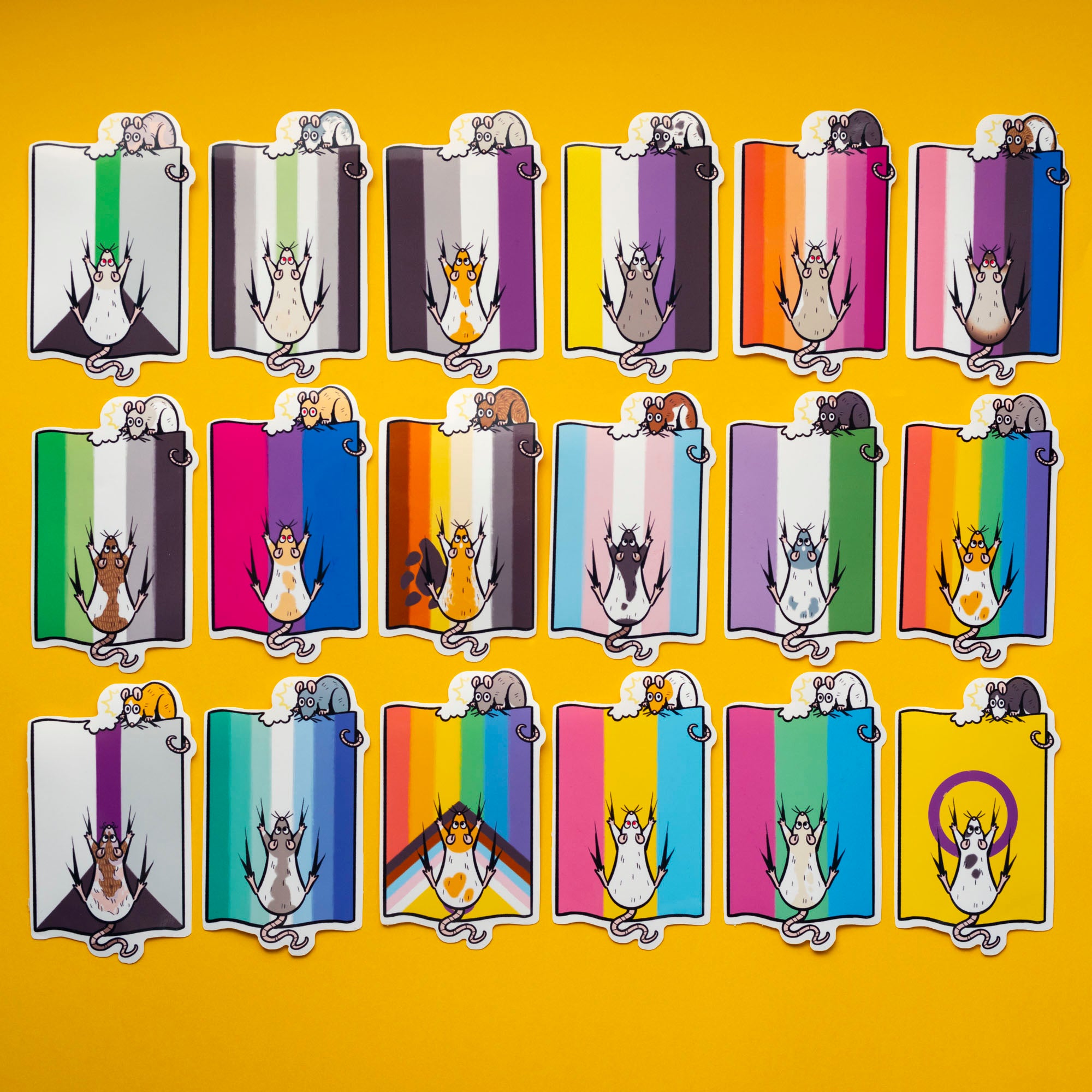Part of a set of 3 sticker designs, available individually or as a set. Perfect for mixing and matching with the other Pride Rats in different flags and styles!