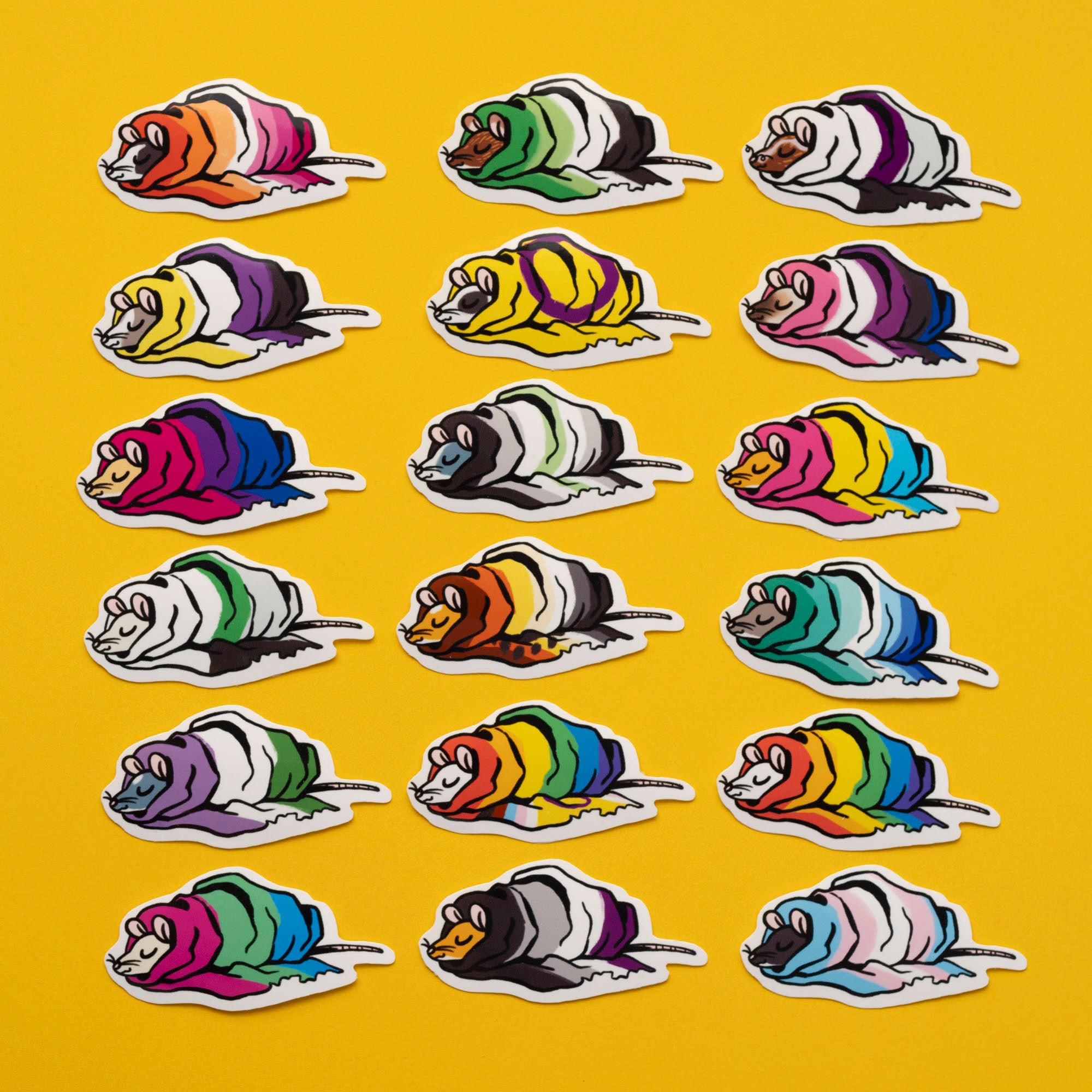 Part of a set of 3 sticker designs, available individually or as a set. Perfect for mixing and matching with the other Pride Rats in different flags and styles!