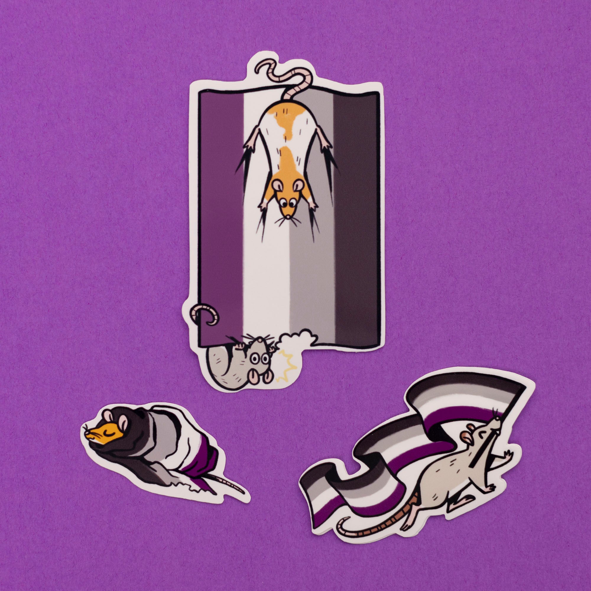 A set of three matching vinyl stickers featuring some happy little rats climbing on, carrying, and wrapped up in the LGBTQIA+ Pride flag of your choice!