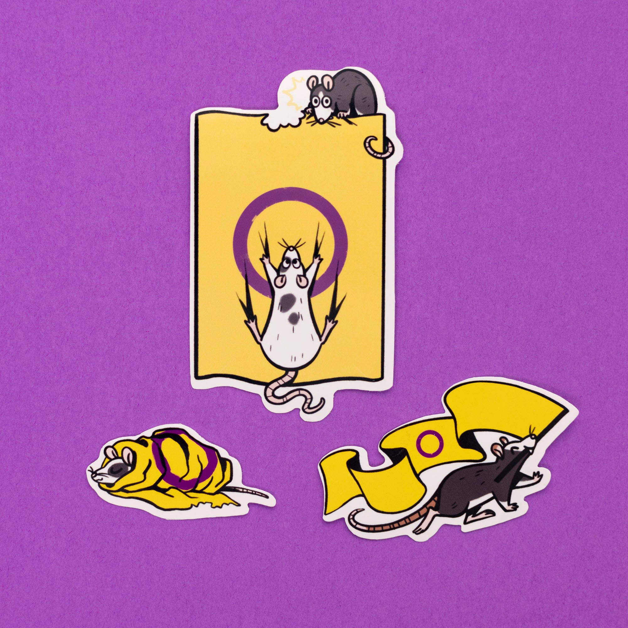 A set of three matching vinyl stickers featuring some happy little rats climbing on, carrying, and wrapped up in the LGBTQIA+ Pride flag of your choice!