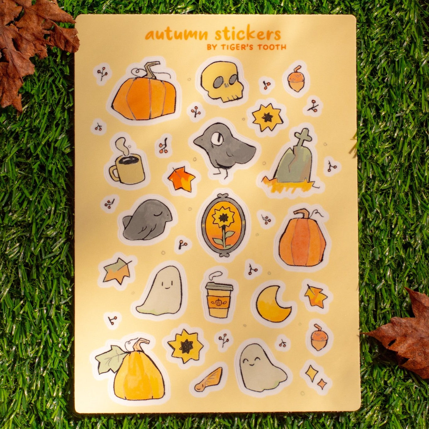 celebrate the coming fall with a spooky sticker sheet! filled with ghosts, crows, leaves, pumpkins, and more.