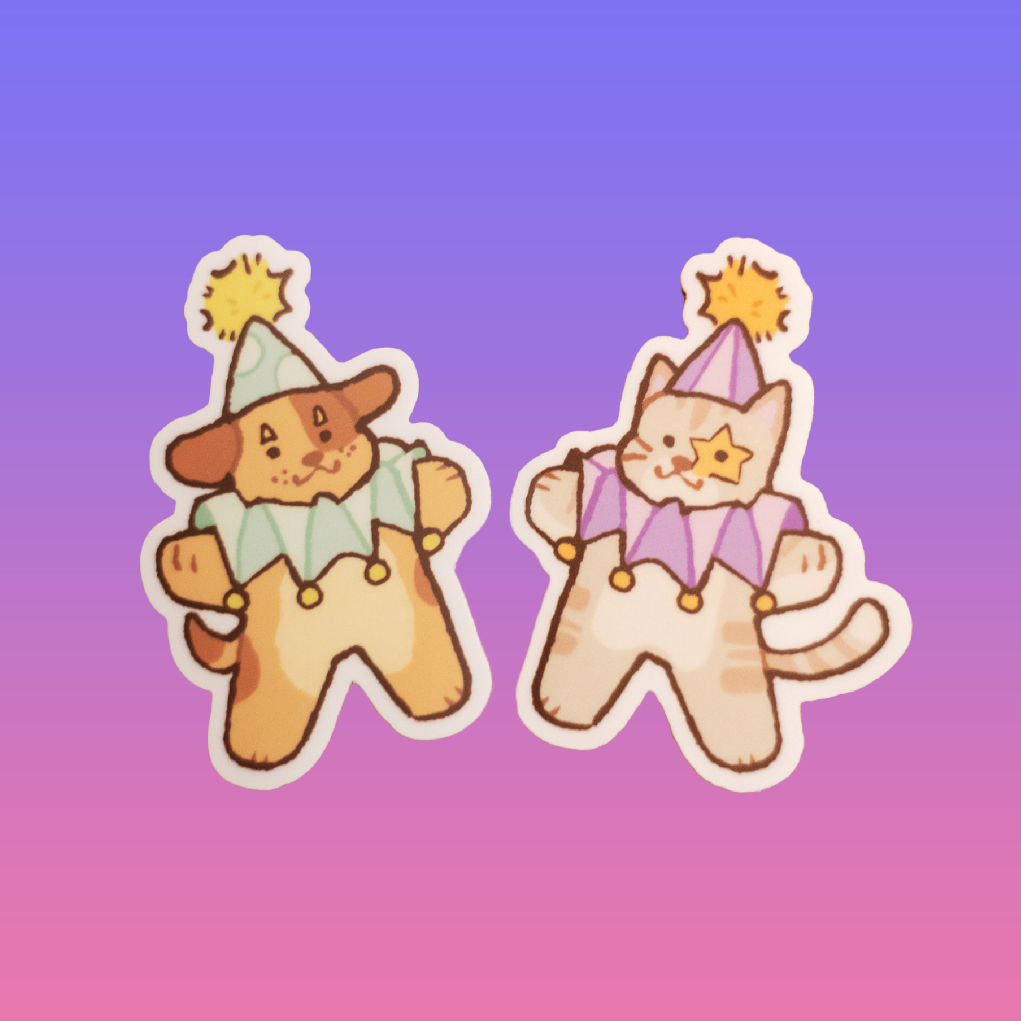 check out these little clowns! meet riddles the cat and banjo the puppy, two friends who love being silly together!bundle contains both riddles AND banjo stickers.