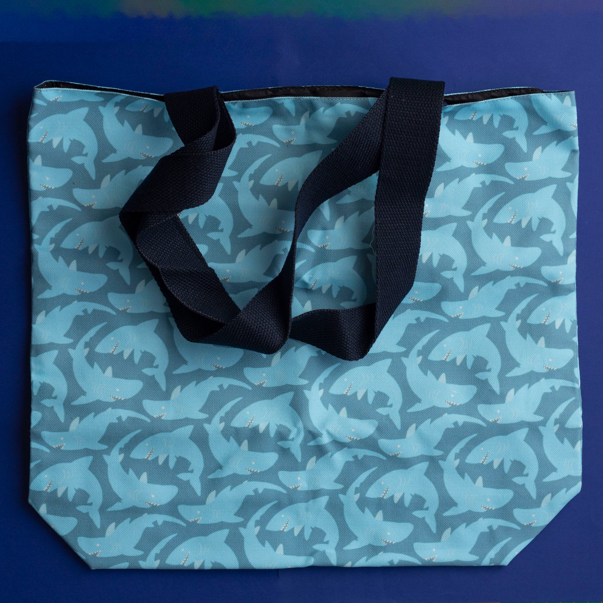 Sharks tote bag! Big enough for your groceries and with long handles so you can carry it over your shoulder easily!- Measures 40x35 cm (15.5x13.5 inches)- sturdy canvas-like fabric- all over colourful print (front and back)- feature inner zipper pocket (easily large enough for phone, wallet, glasses case, etc!!)- flat sewn bottom (11cm wide)- long handles