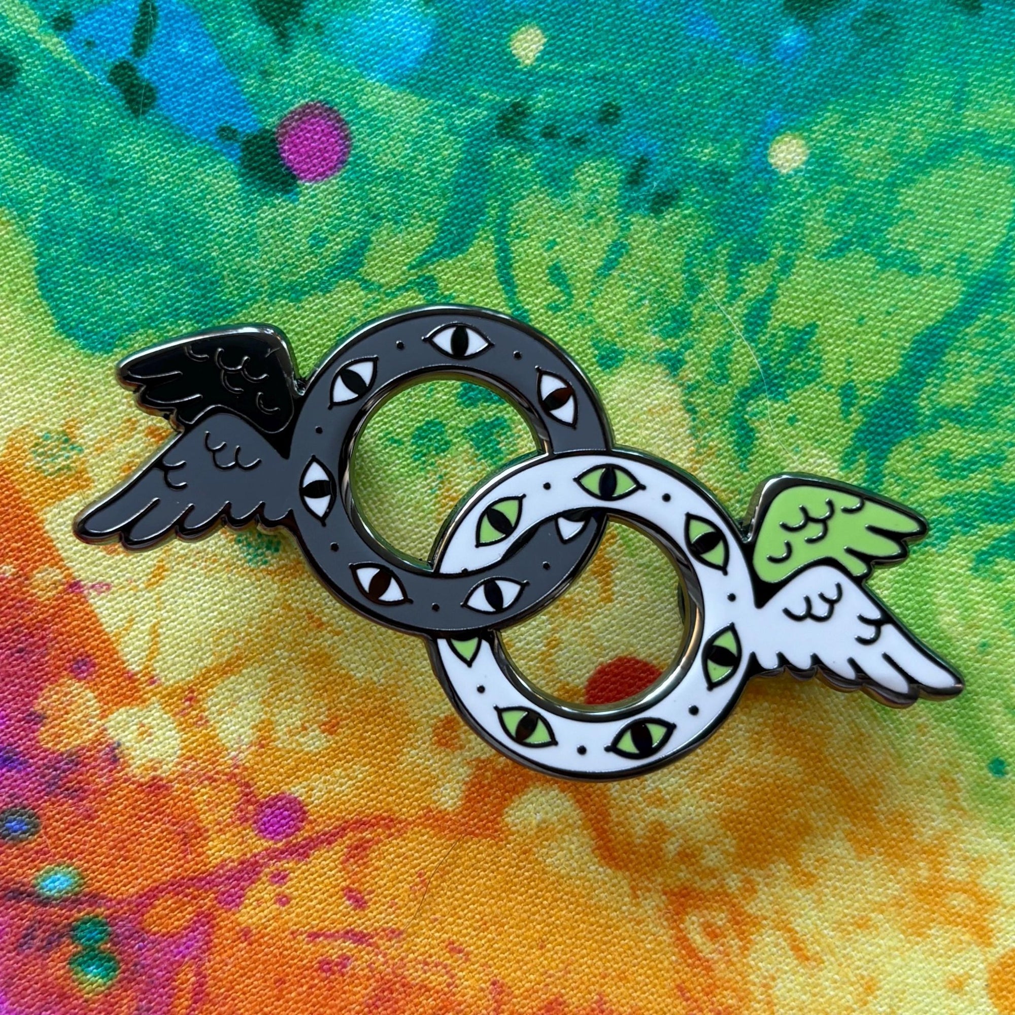 | This pin has hard enamel, two pin posts, and rubber backings. It is 2 inches wide with black nickel plating. |