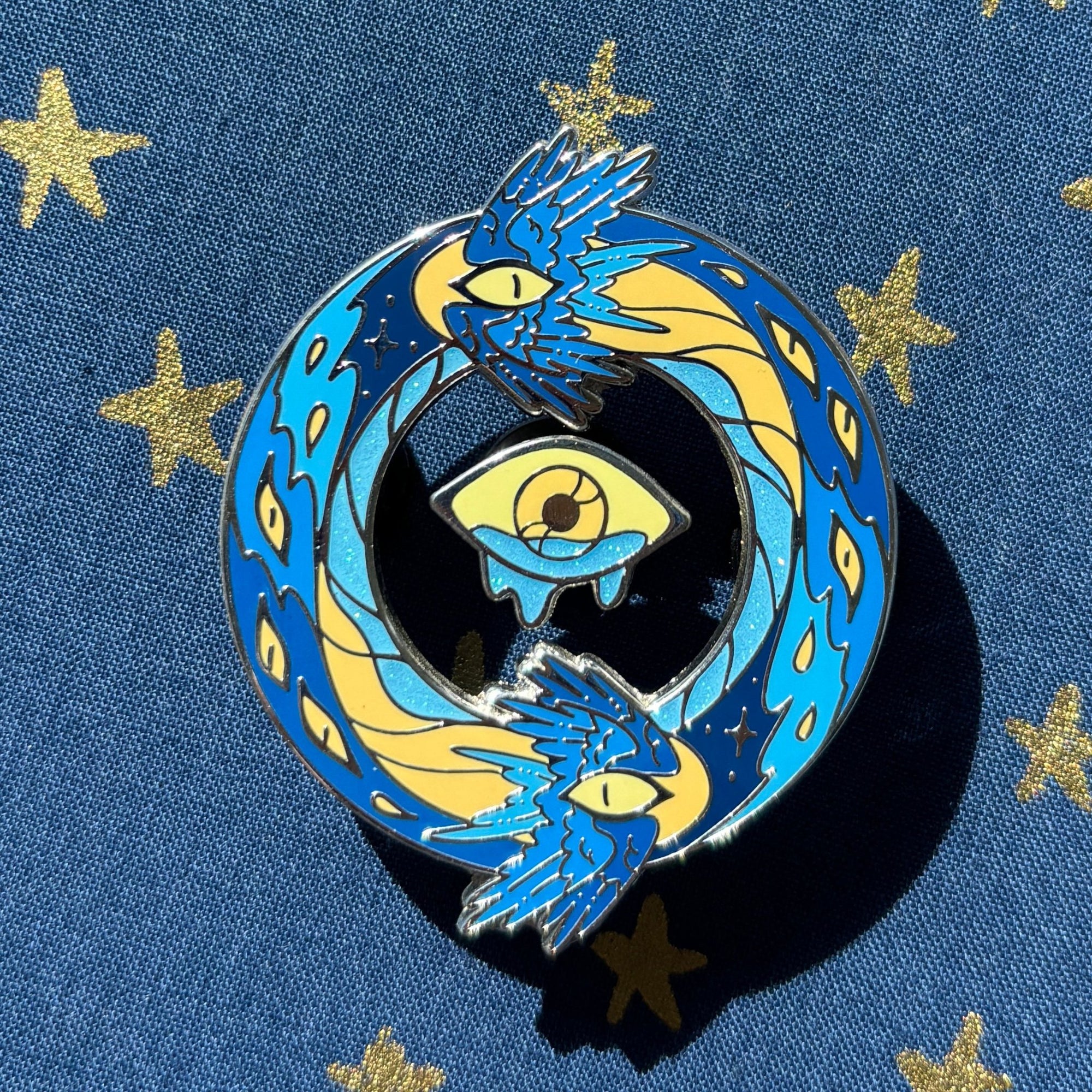 This pin consists of two parts, twin seraphim and an eye mini-pin. It features light blue glitter enamel and measures a little under 2 in (5 cm) wide. The main pin has two pin posts, the eye has one. The pins have hard enamel and silver plating, as well as rubber clutches.