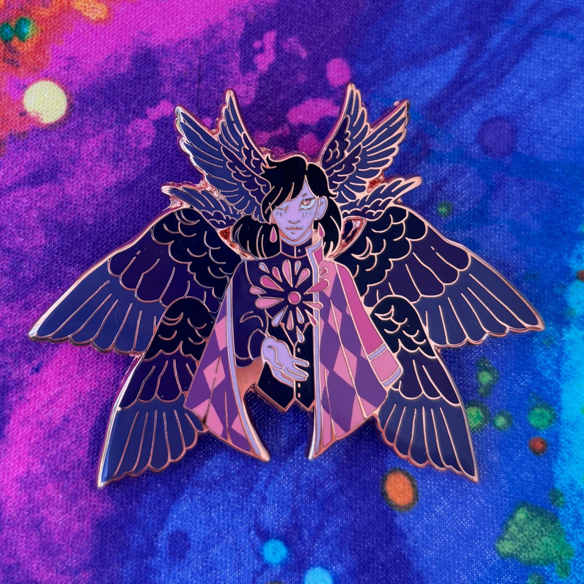 | A design inspired by the wizard Howl Pendragon. This pin is 2.5 inches (6.3 cm) wide, with rose gold plating, hard enamel, and screenprint. It has two pin posts and rubber backings. |