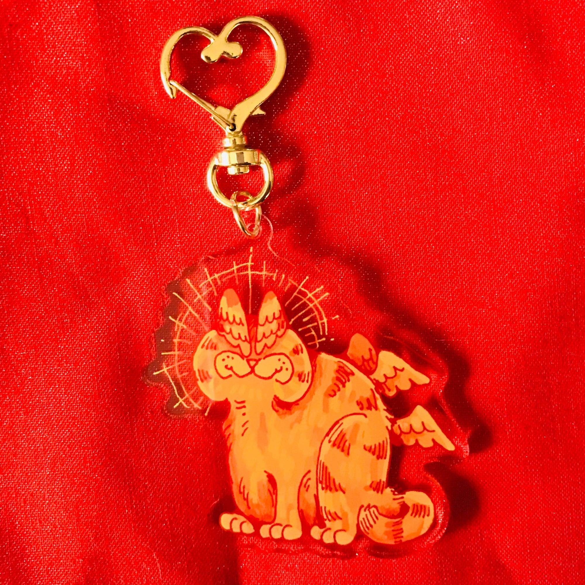 This acrylic keychain is 2.5 inches (6.3 cm) long, double-sided with the same print on each side. The keychain has a gold heart clasp.