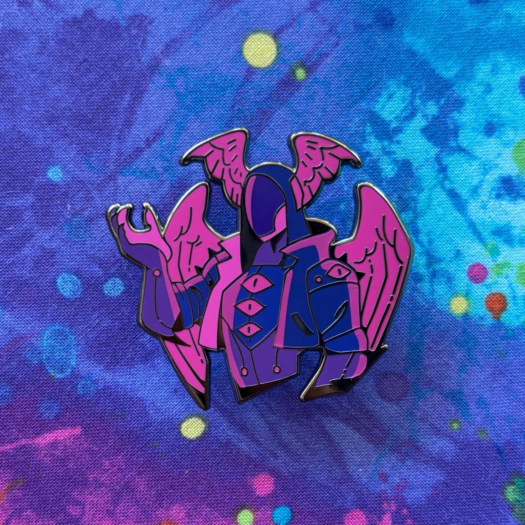 | This pin is 1.9 inches wide with black nickel plating and screenprinting. It has hard enamel and two pin posts with rubber backings. |