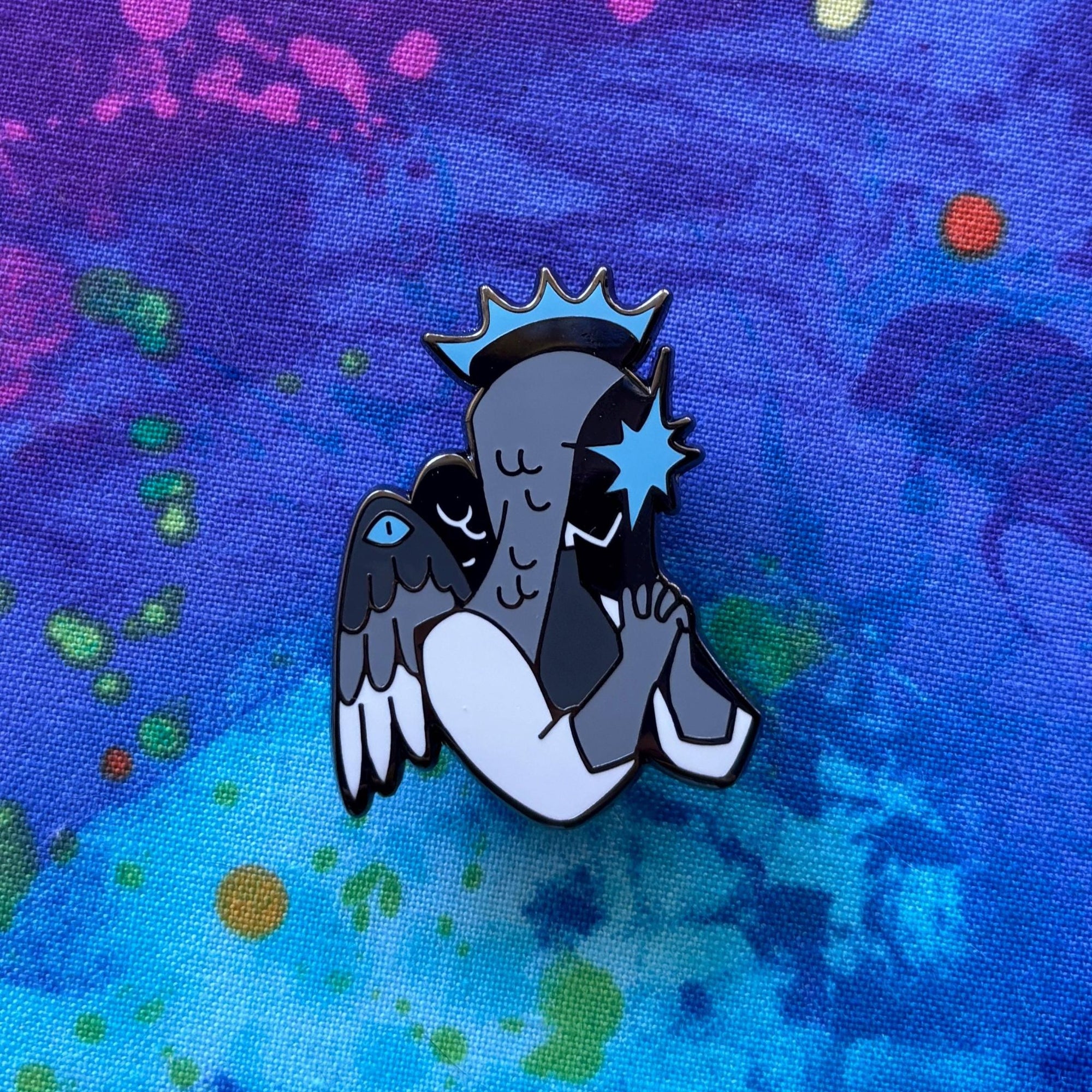 This pin has hard enamel, rubber backings, and two pin posts. It is 1.45 inches long with black nickel plating.