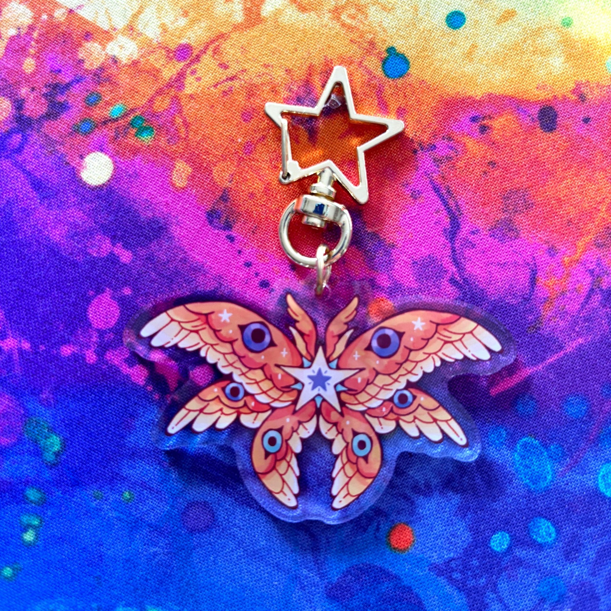 | This acrylic keychain is 2.5 inches (6.3 cm) on the longest side, double-sided with the same print on both sides; it has a gold star clasp. |