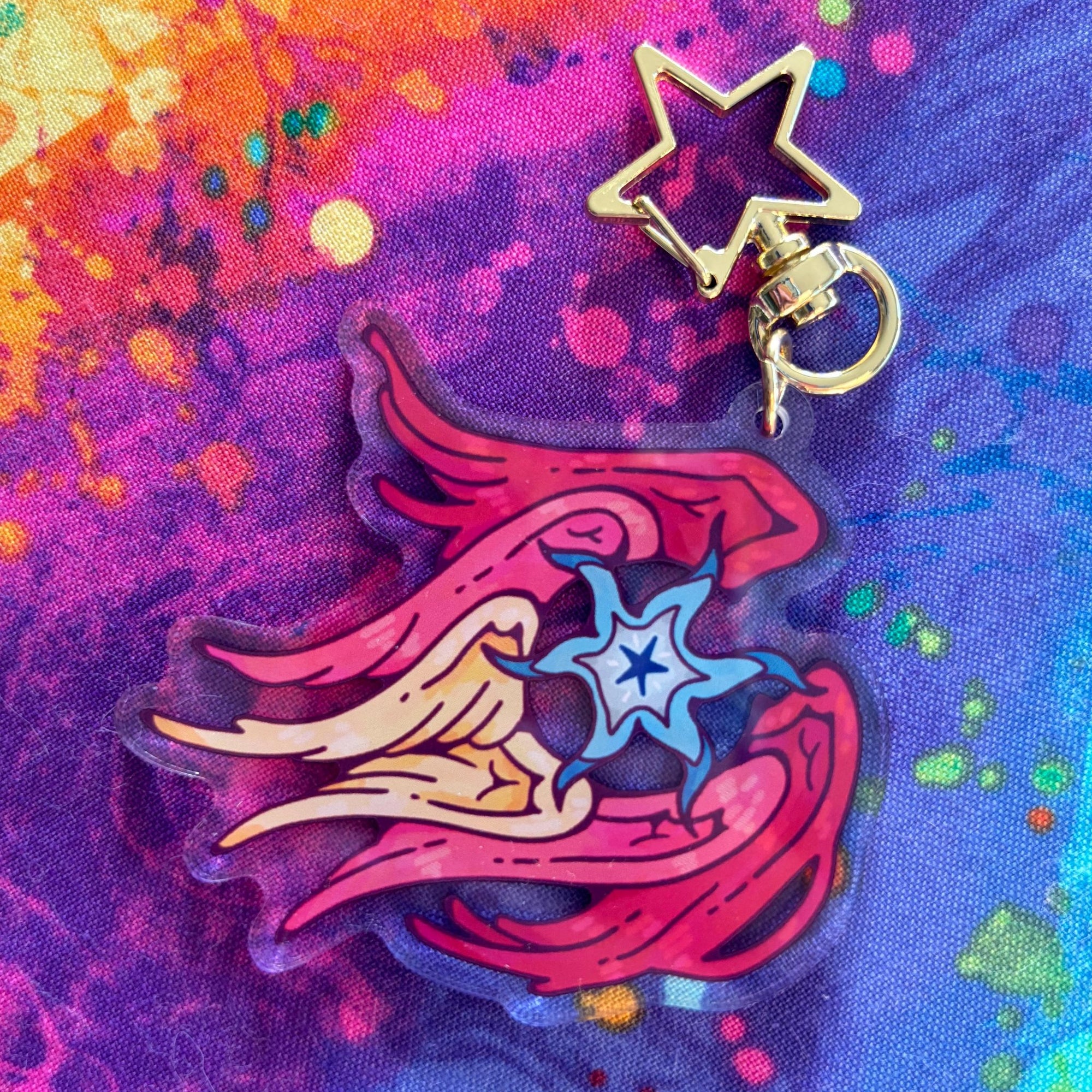 | This acrylic keychain is 2.5 inches (6.3 cm) on the longest side, double-sided with the same print on both sides; it has a gold star clasp. |