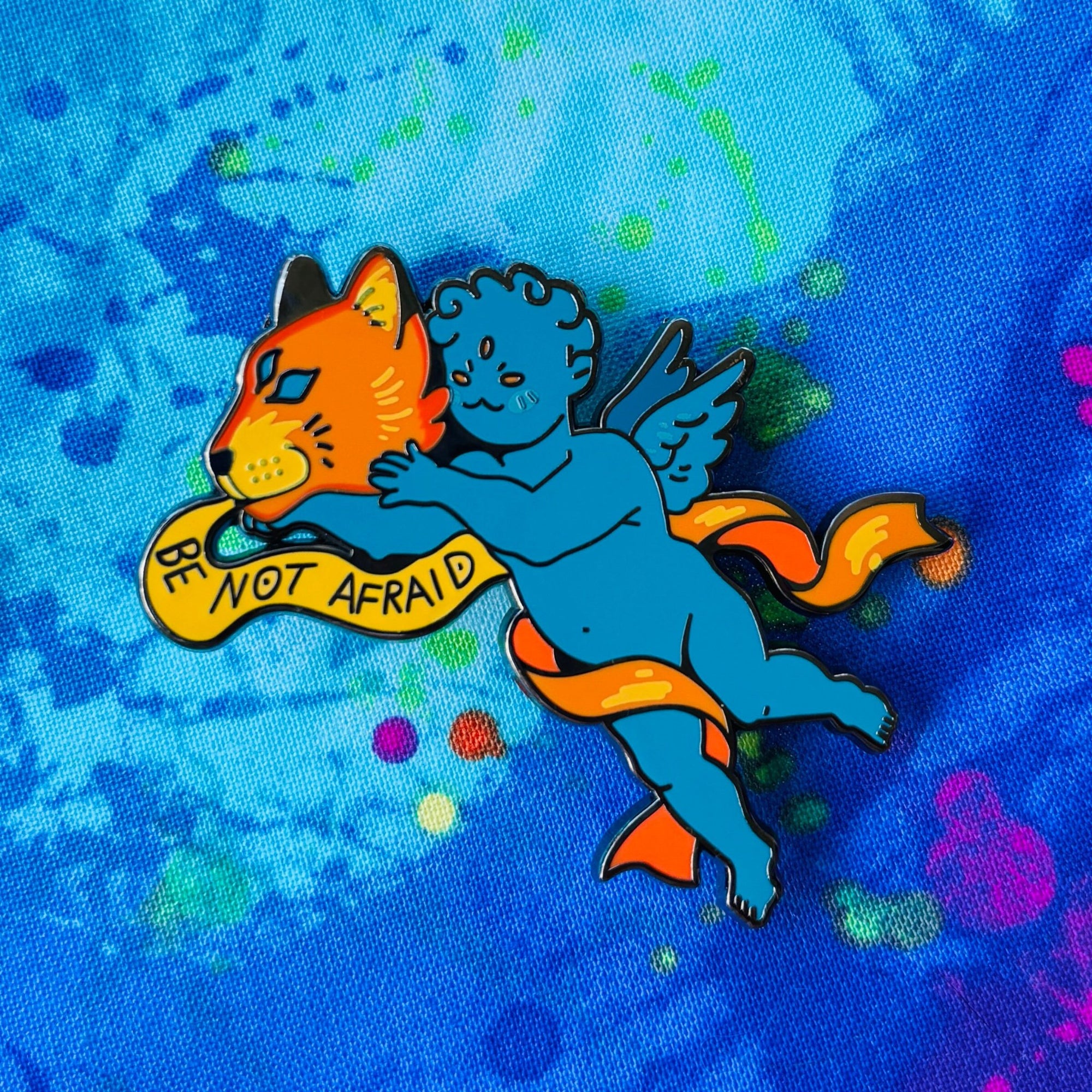 Each pin is about 2 inches (5 cm) wide with hard enamel, black nickel plating, and screenprint. They have two pin posts and rubber backings.