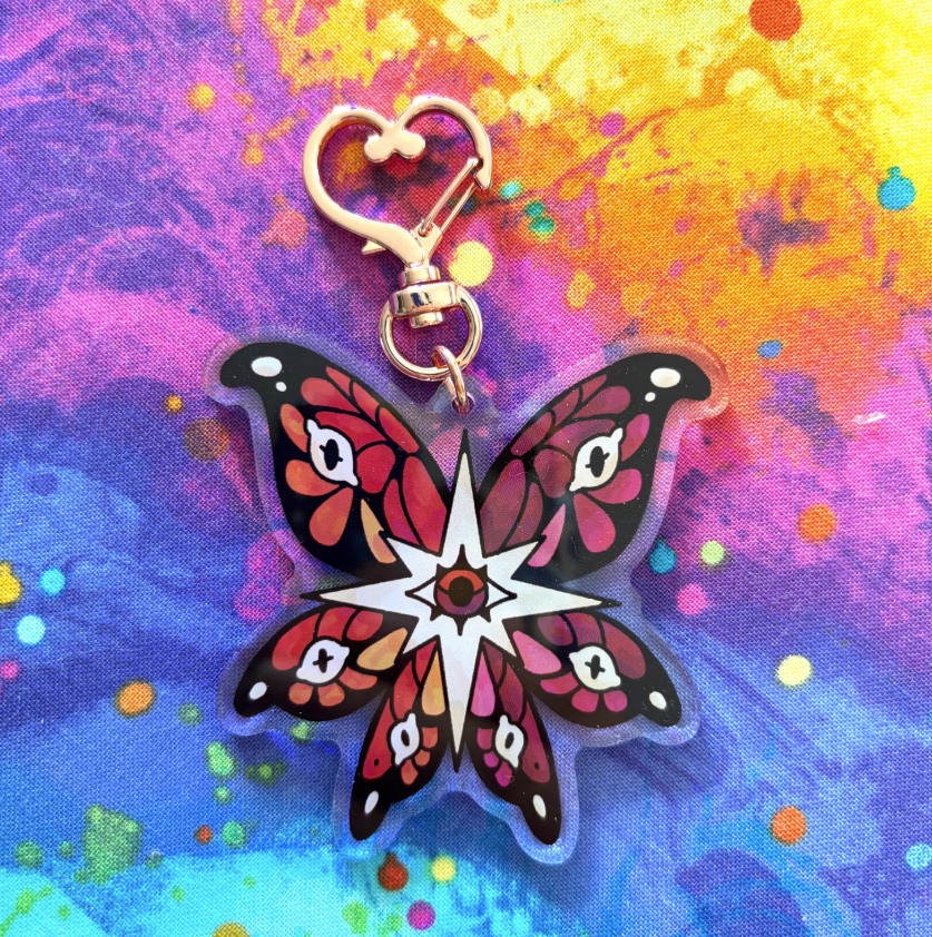 This acrylic keychain is 2.5 inches (6.3 cm) on the longest side, double-sided with the same print on both sides; it has a rose gold heart clasp.