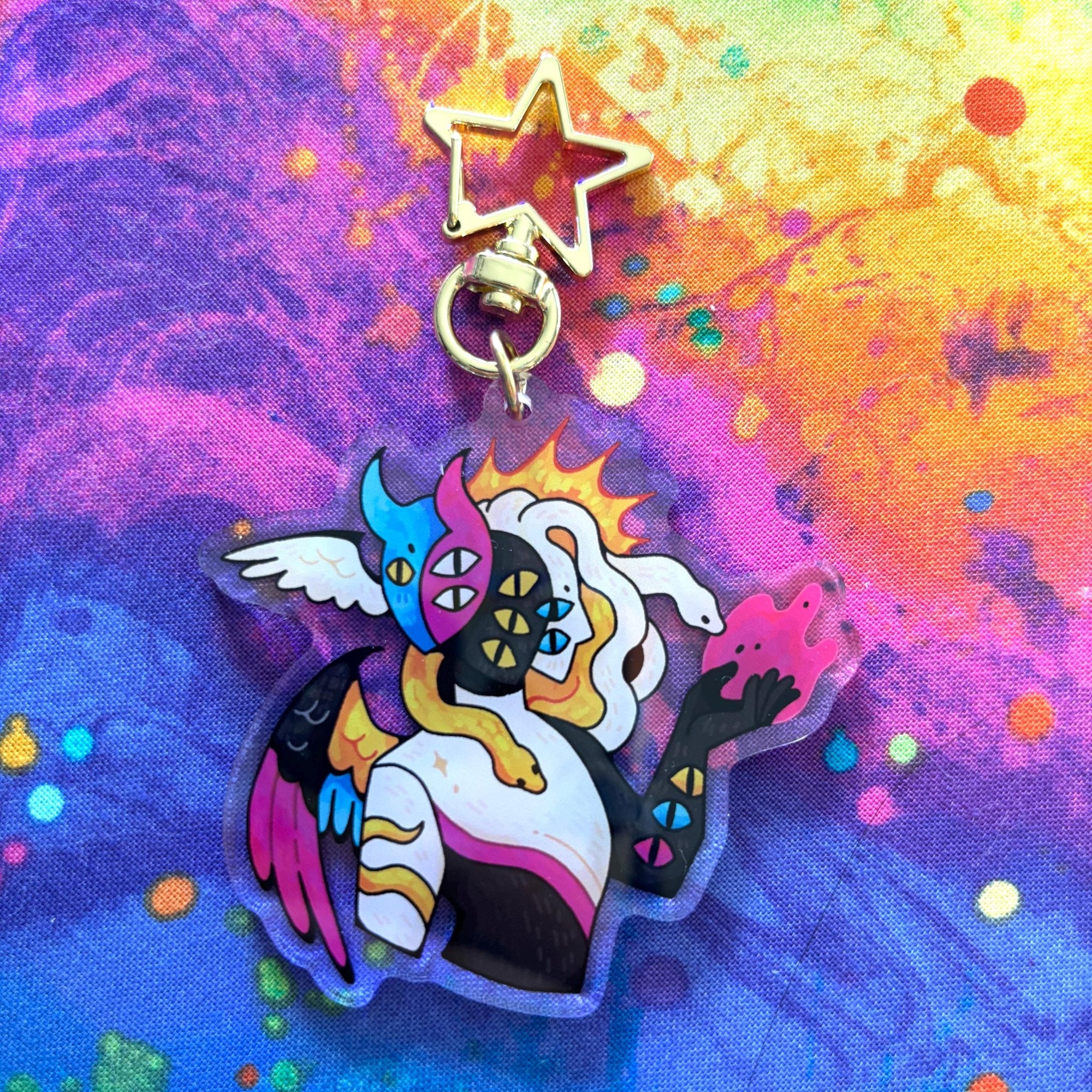 | This acrylic keychain is 2.5 inches (6.3 cm) on the longest side, double-sided with the same print on both sides; it has a gold star clasp. |