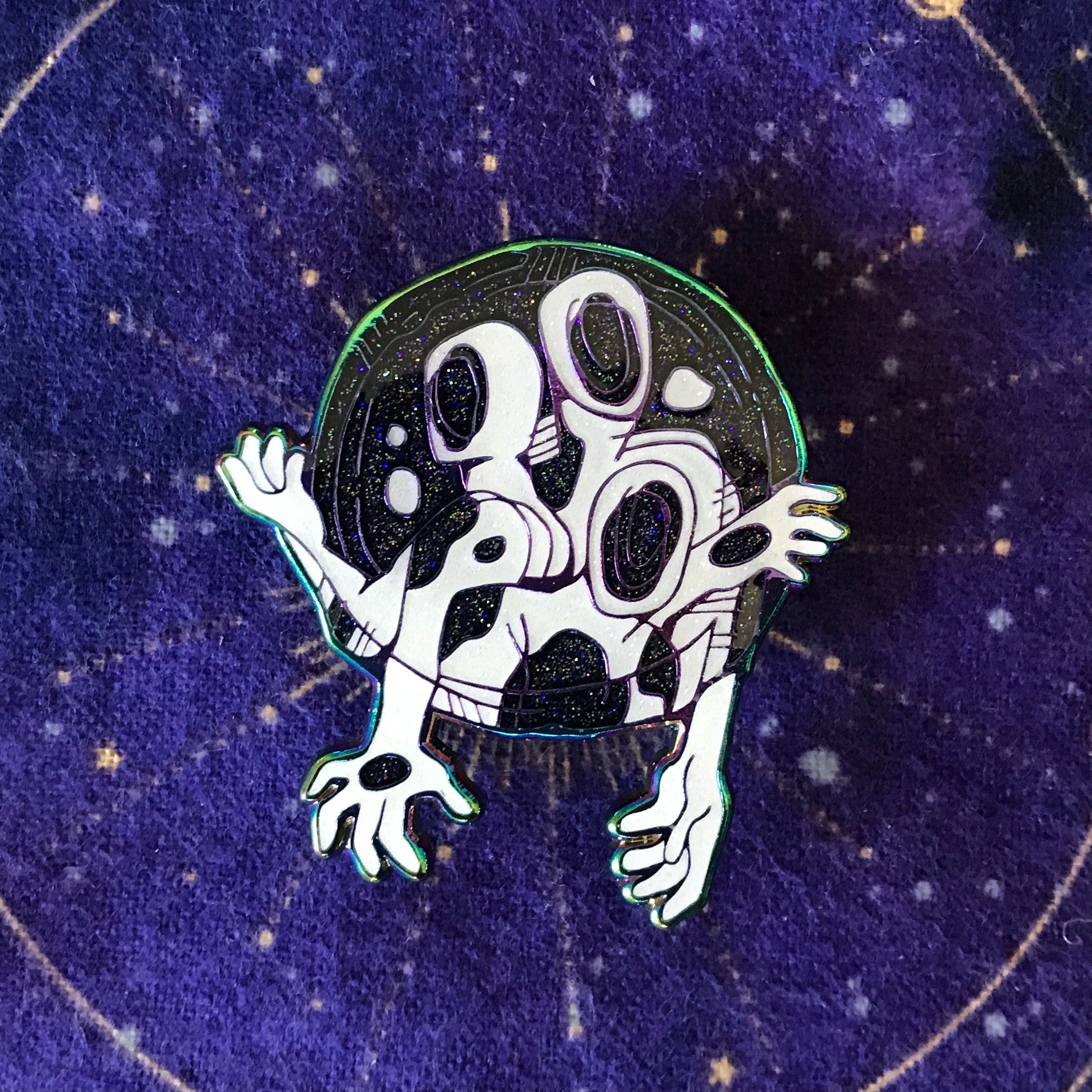 These pins are approximately 2 in (5 cm) long. Each pin has soft enamel with epoxy, rainbow plating, glitter, and two pin posts with rubber clutches.