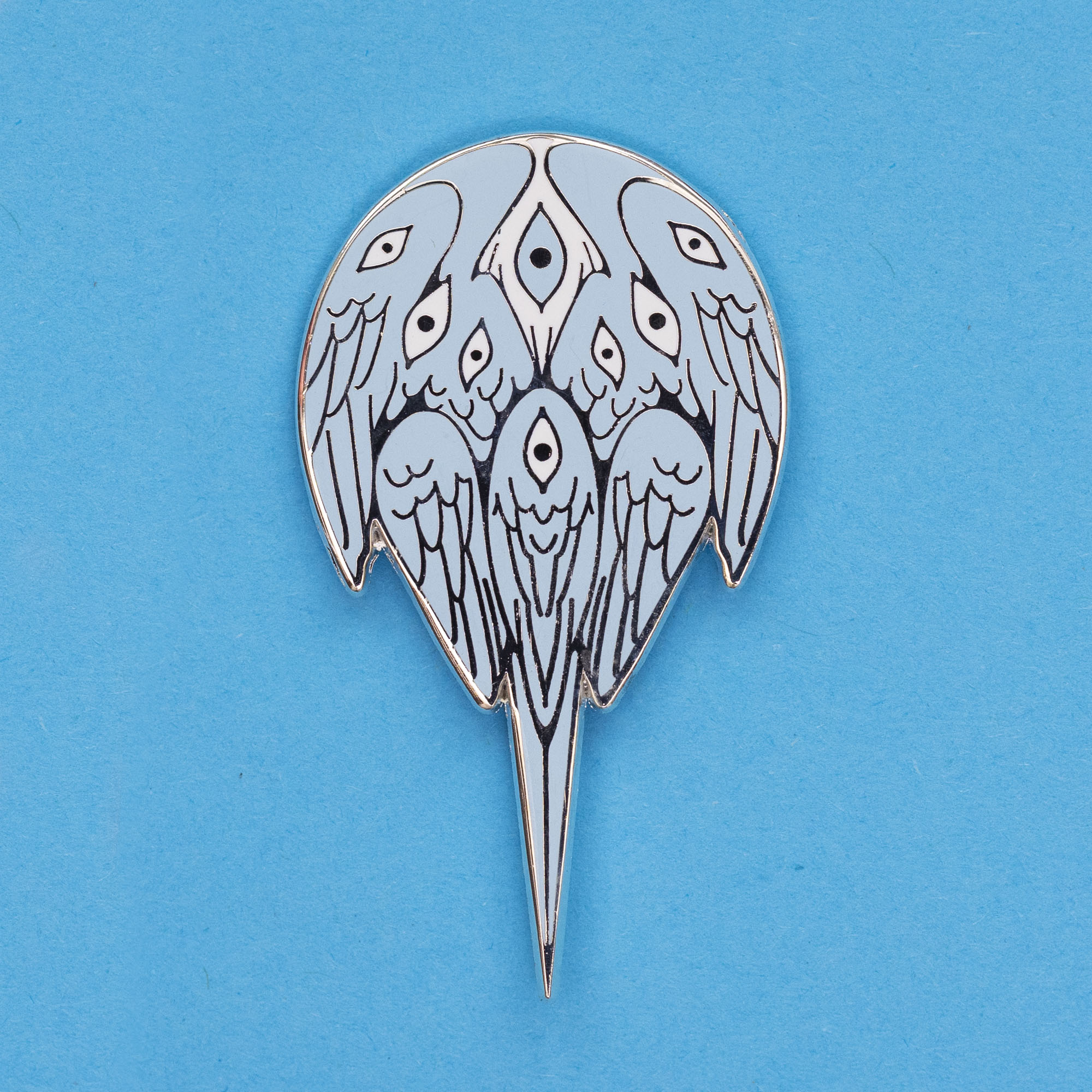 This pin is approximately 1 in (2.5 cm) wide. The pin has hard enamel and two pin posts with rubber clutches. It is available with blue enamel with silver plating; or glitter enamel with gold plating.