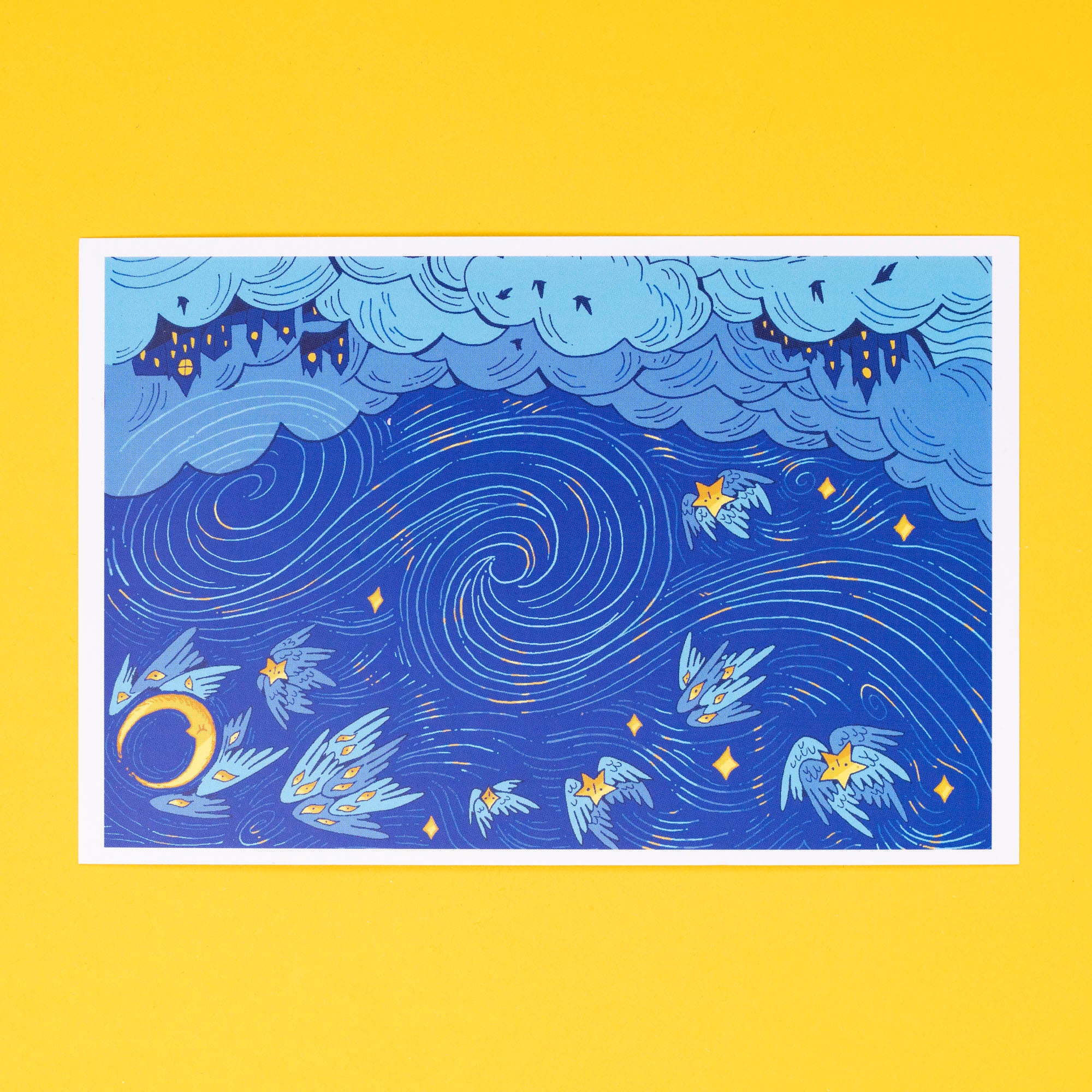 A flock of nocturnal angels fill the sky with color and light. This mini print is 4 x 6 inches (10 x 15 cm). It is printed on matte cardstock and has a white border.