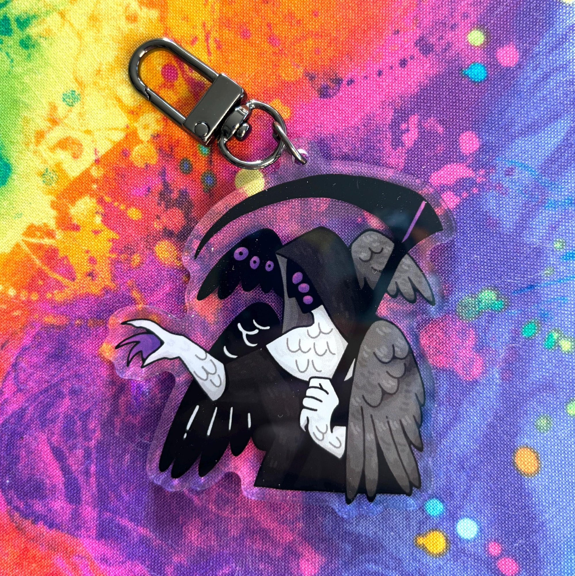 This acrylic keychain is 2.5 inches (6.3 cm) on the longest side, double-sided with the same print on both sides; it has a gun metal lobster clasp.