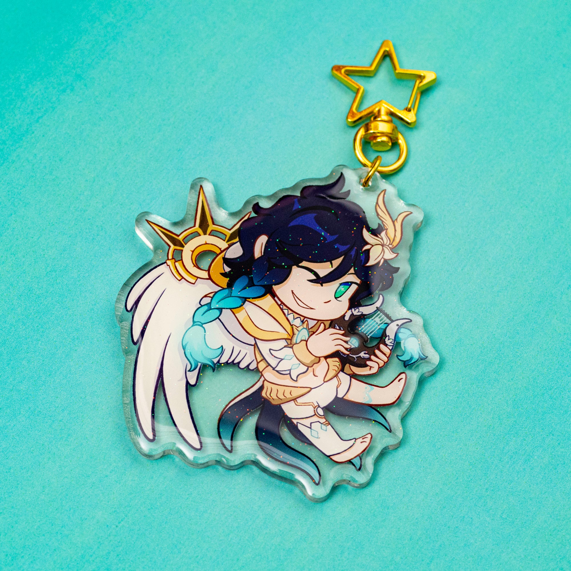 The God of Freedom himself Barbatos, nowadays travelling across Mondstadt as the friendly bard Venti, is gladly happy and willing to meet new companions and friends alike. In charm form!