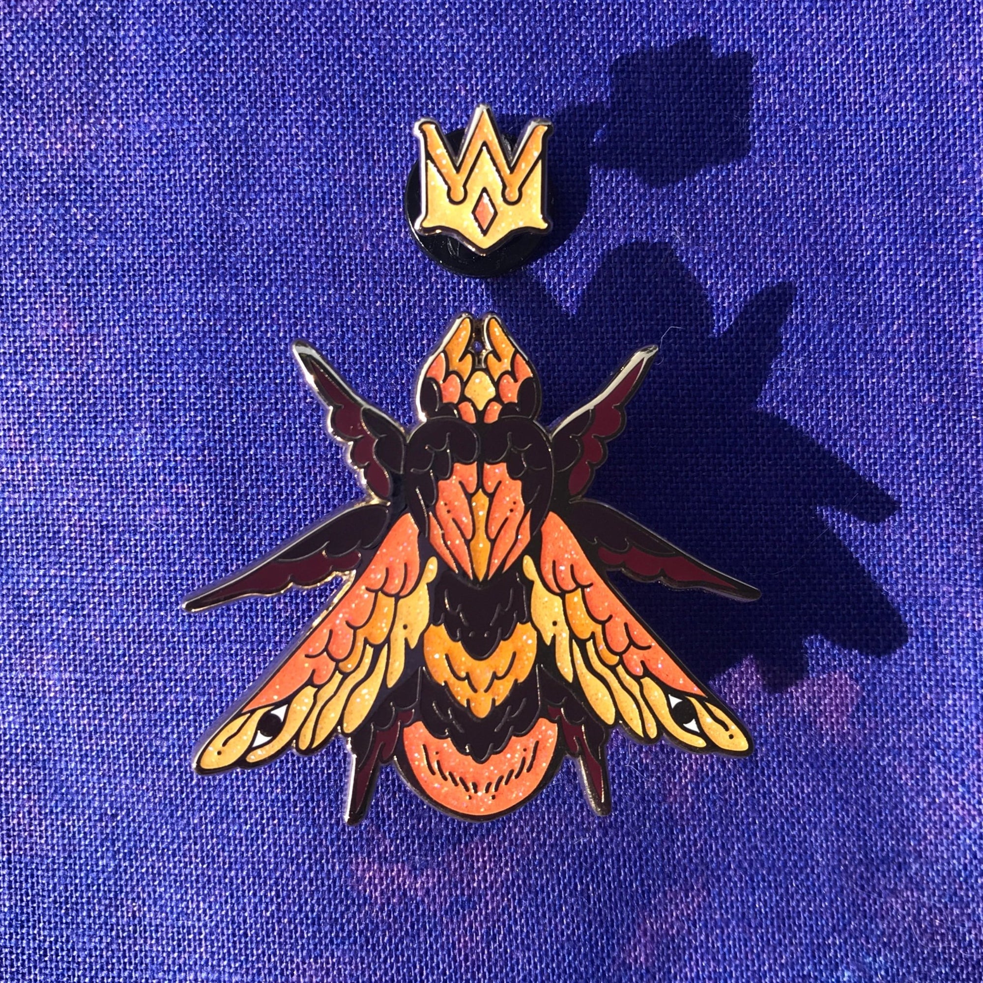 This pin set includes a bee angel pin and a little crown. The bee is approximately 1.5 in (4 cm) wide. The pins are gold plated with hard enamel, the bee has two pin posts and the crown has one. Each has glitter enamel.