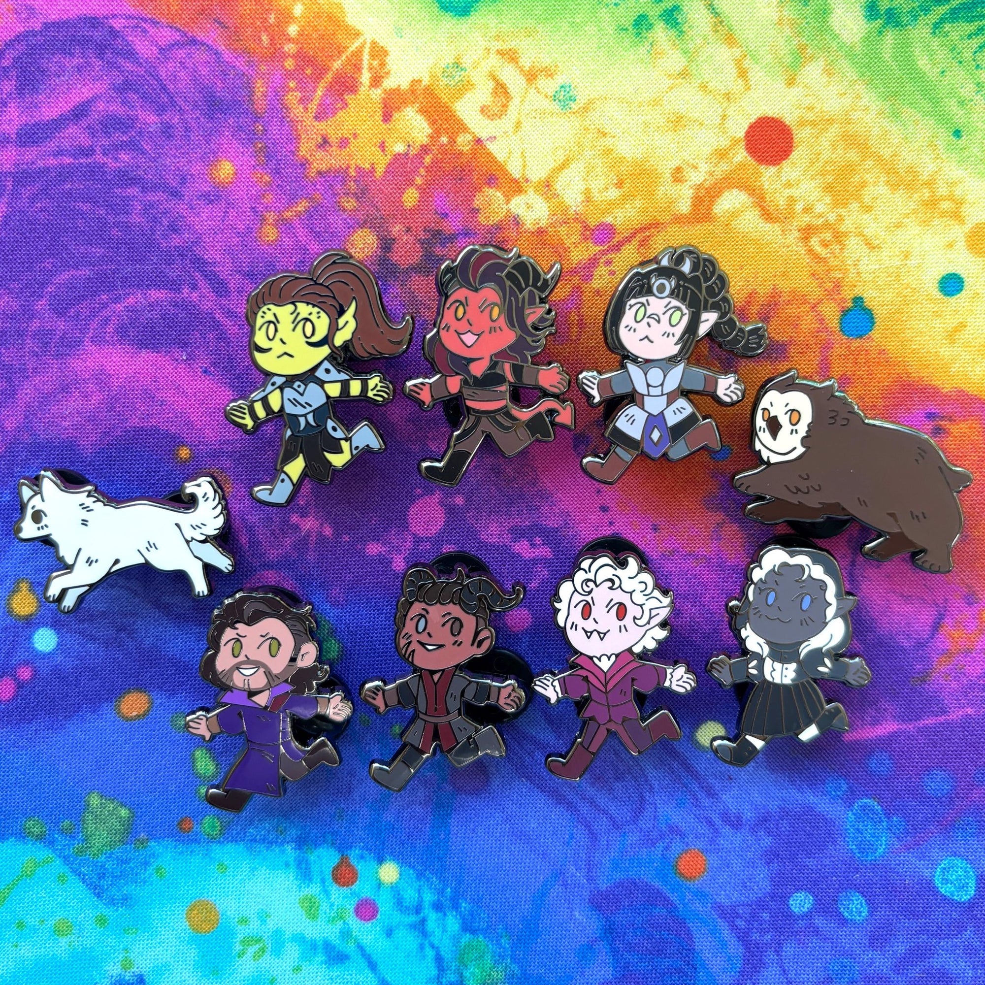 The six origin companions from Baldur's Gate 3; plus Scratch, Owlbear, and my Tav Charity. They are posed so that they can sort of hold hands :))