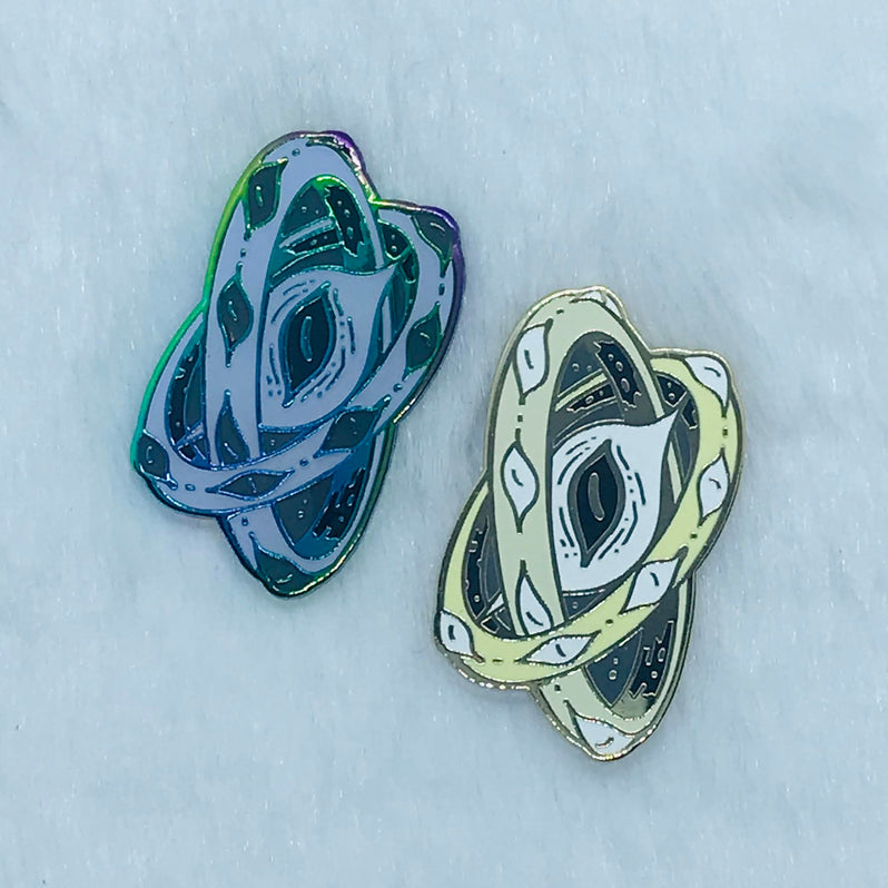 An all-consuming angel of the cosmos.This pin is approximately 1 in (2.5 cm) wide. The pin has two pin posts with rubber clutches. It is available with rainbow plating and soft enamel with epoxy; or gold plating with hard enamel.Rainbow plating is unique for every pin - no two are alike with differing metal colors. The plating may appear different than the example images shown in this listing.This listing is for standard grade pins only. Standard grade pins may have one or two tiny imperfections.