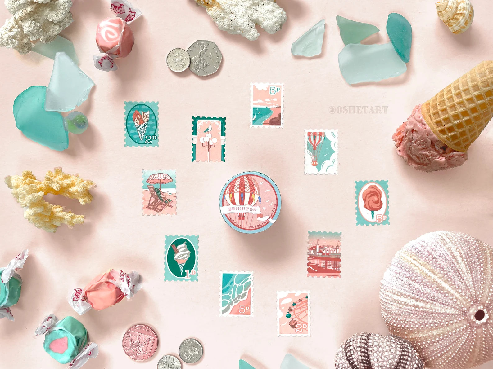 Stamp washi tape featuring a Brighton-inspired design! Features landmarks like Brighton Pier, beach ruins, and familiar treats like candy floss, fish and chips, and soft serve with a Flake chocolate bar! 24 x 35 mm per stamp 5 m total length