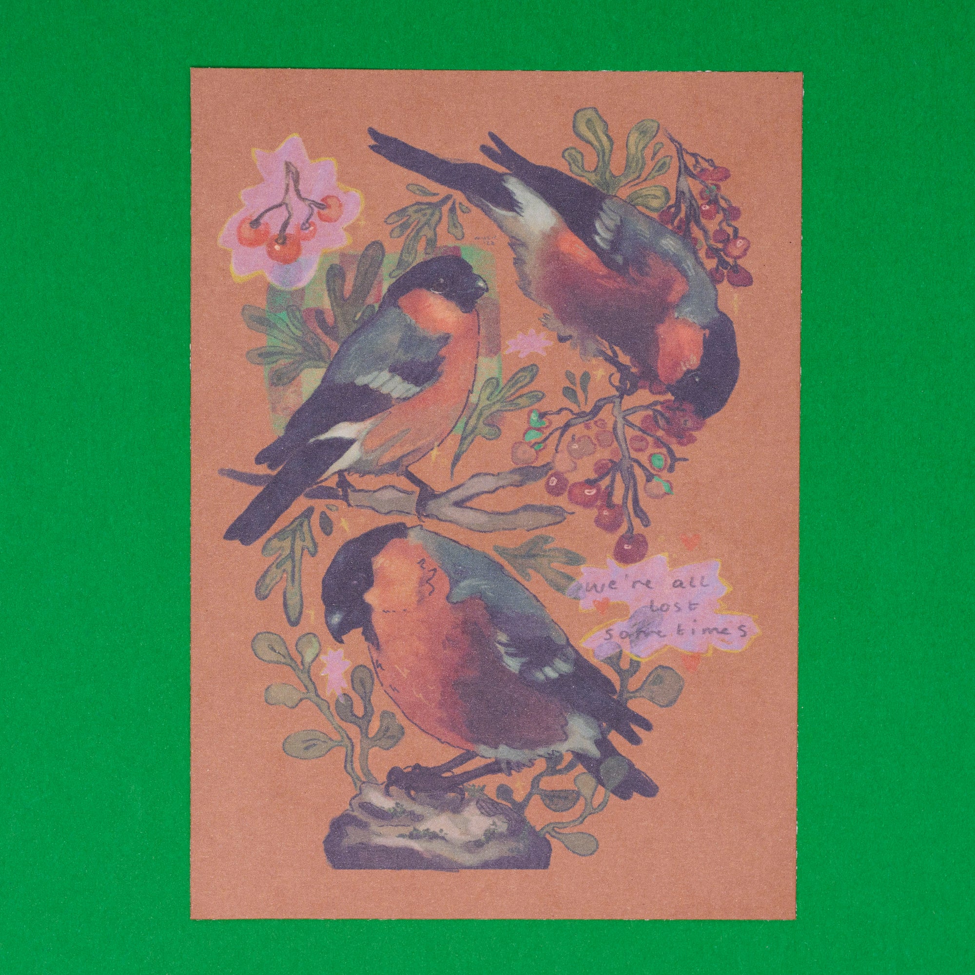 "we're all lost sometimes" featuring a collage of bullfinches, cherries, foliage, and bursts of colour.