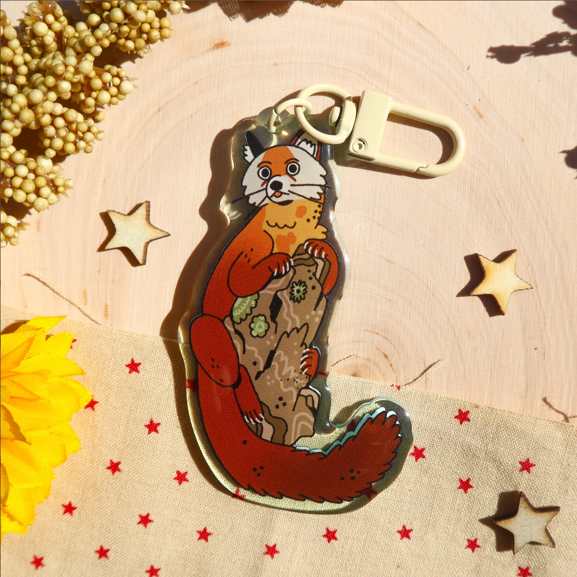 3" epoxy acrylic keychain of a happily perched american marten with a cream colored clasp